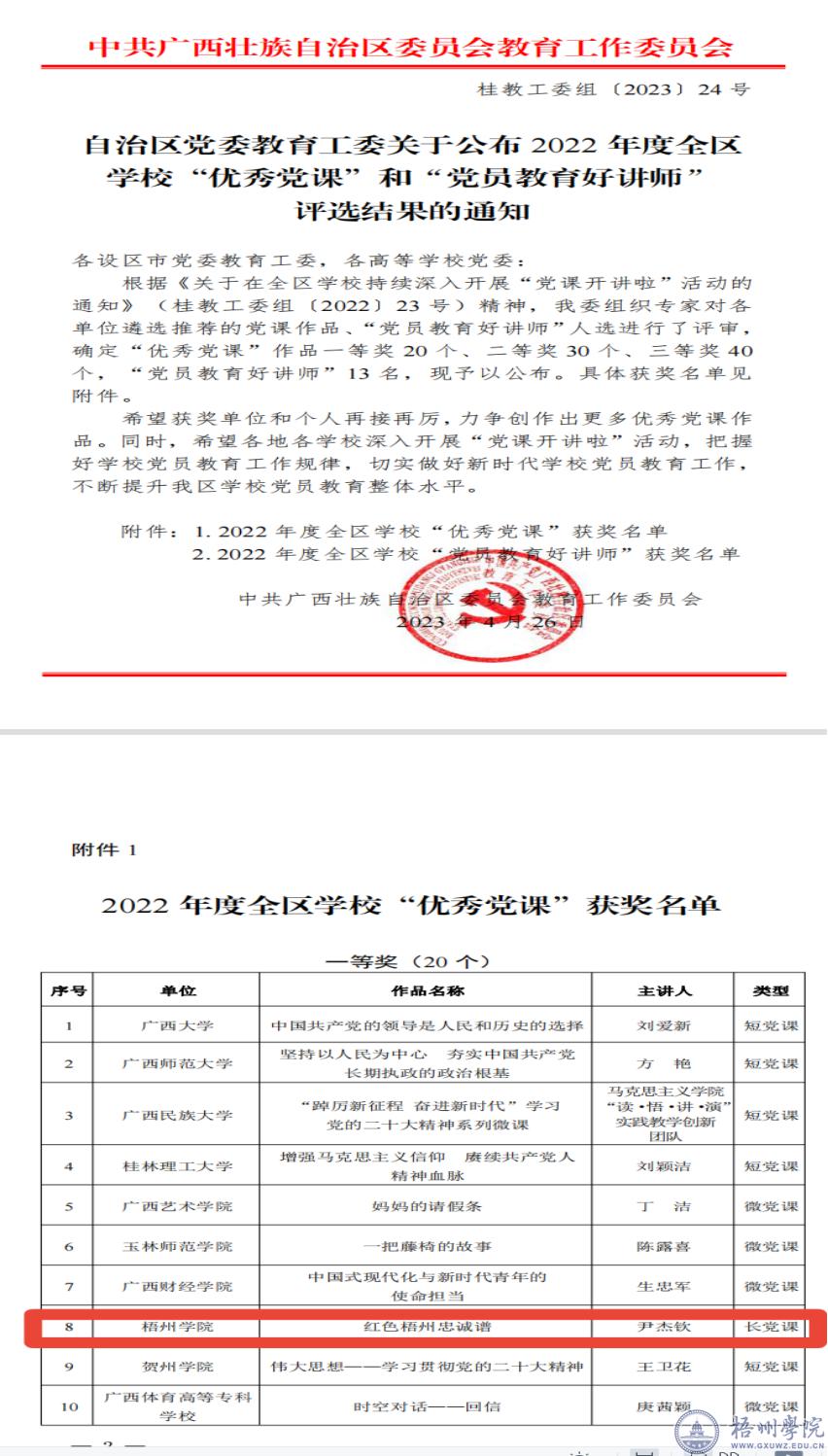 近日,自治区党委教育工委公布2022年度全区学校“优秀党课”和“党员教育好讲师”评选结果,由我校马克思主义学院院长尹杰钦主讲,冀宁、叶子琛、陈驰宇、蔡林峰、龙慕兰作为副主讲人的《红色梧州忠诚谱》荣获“优秀党课”一等奖。