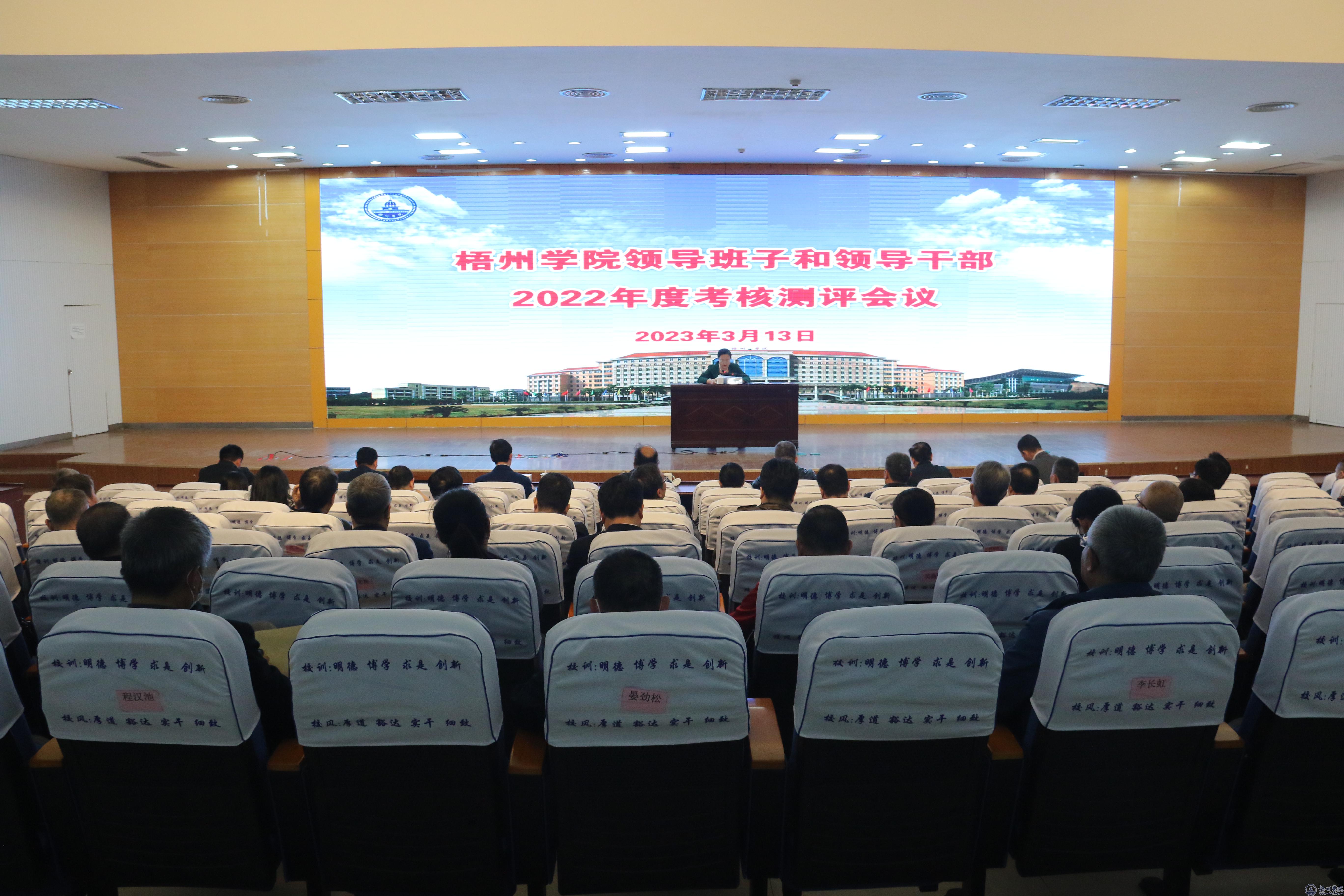 3月13日下午,我校在明理楼学术报告厅召开学校领导班子和领导干部2022年度考核测评会议。校领导班子成员、中层正职领导干部、正高职称代表参加会议。自治区党委组织部组织六处四级调研员吴向阳同志、梧州市委组织部干部一科副科长梁贤同志到会指导工作。