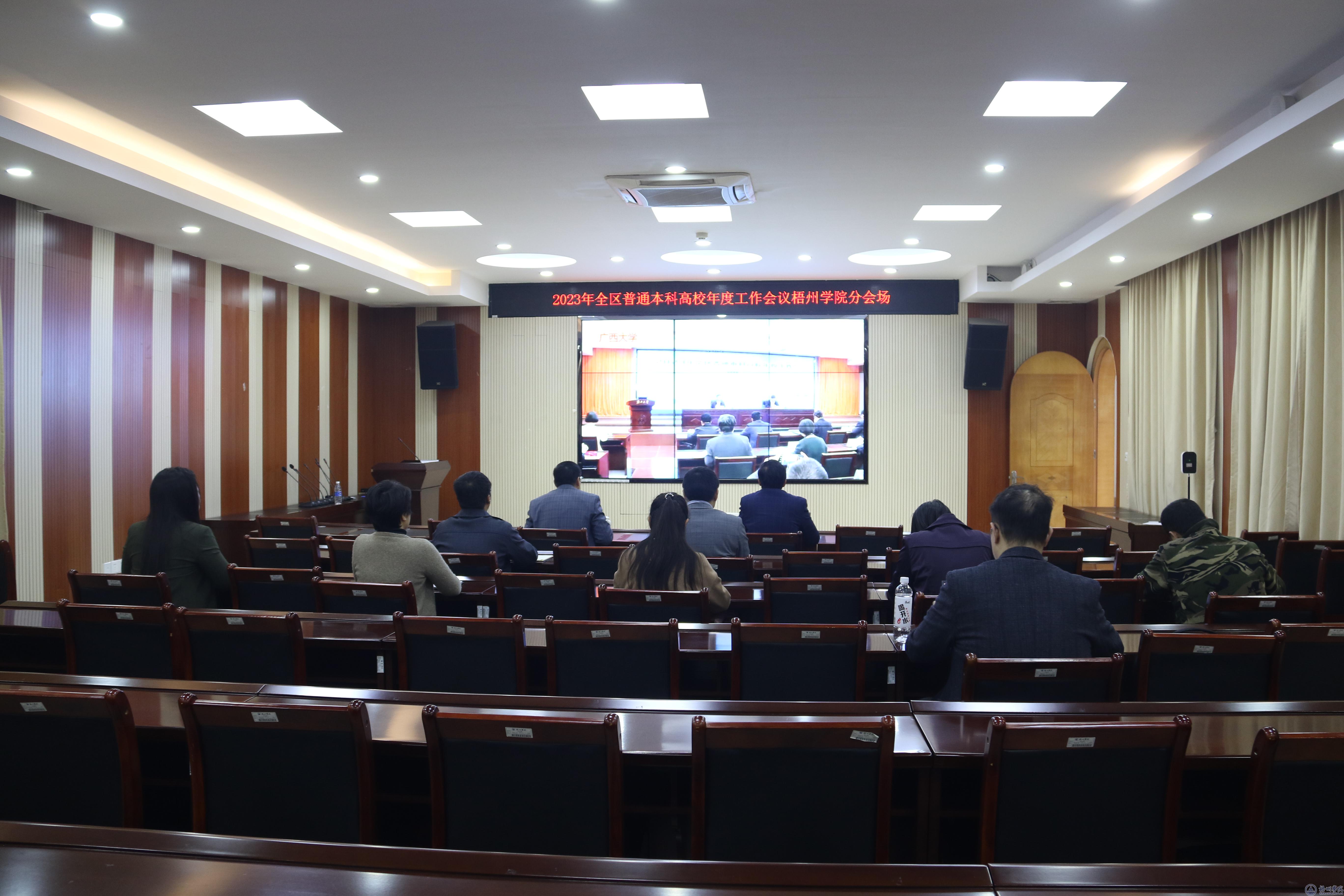 我校杨奔校长、教务处主要负责人在广西大学主会场参加会议。副校长麻新纯、宾月景,教务处、发展规划处、科研处相关负责人在学校分会场参加视频会议。