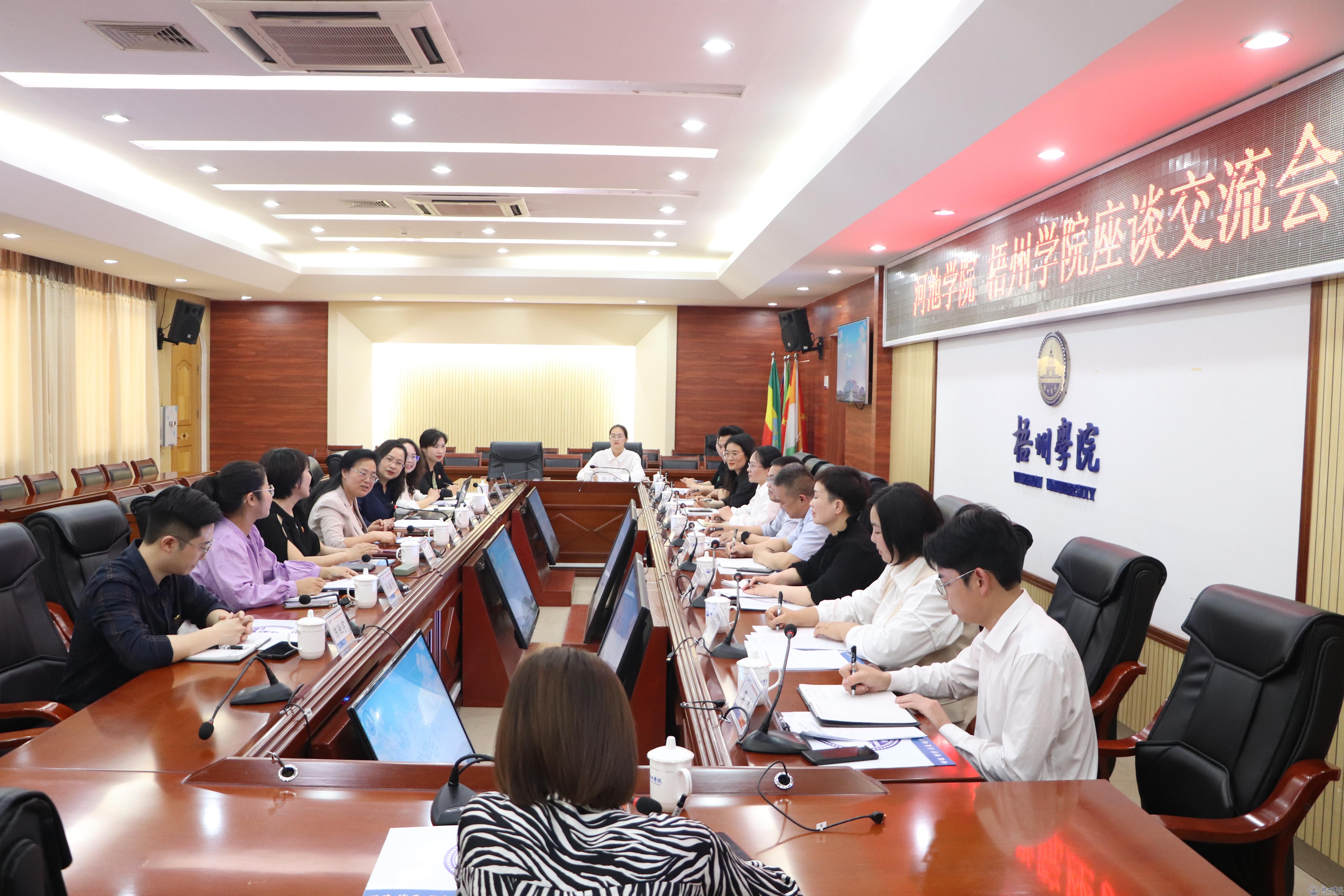 双方在明理楼八楼会议室召开座谈会,韦仕珍书记在主持讲话中表示两校一家亲,希望以此次交流为契机,在党建、宣传、教学科研、人才培养等工作领域不断加强沟通与交流,相互学习借鉴,优势互补,实现两校共赢发展。学校党委常委、宣传部部长陈健萍简要介绍了我校办学情况、专业建设等方面的情况。河池学院党委常委、宣传部部长唐毓首介绍了此次学习交流的目的,对我校在党建品牌创建、理论学习中心组学习会等方面的做法表示肯定,希望两校加强沟通交流,互学共鉴共谋发展。