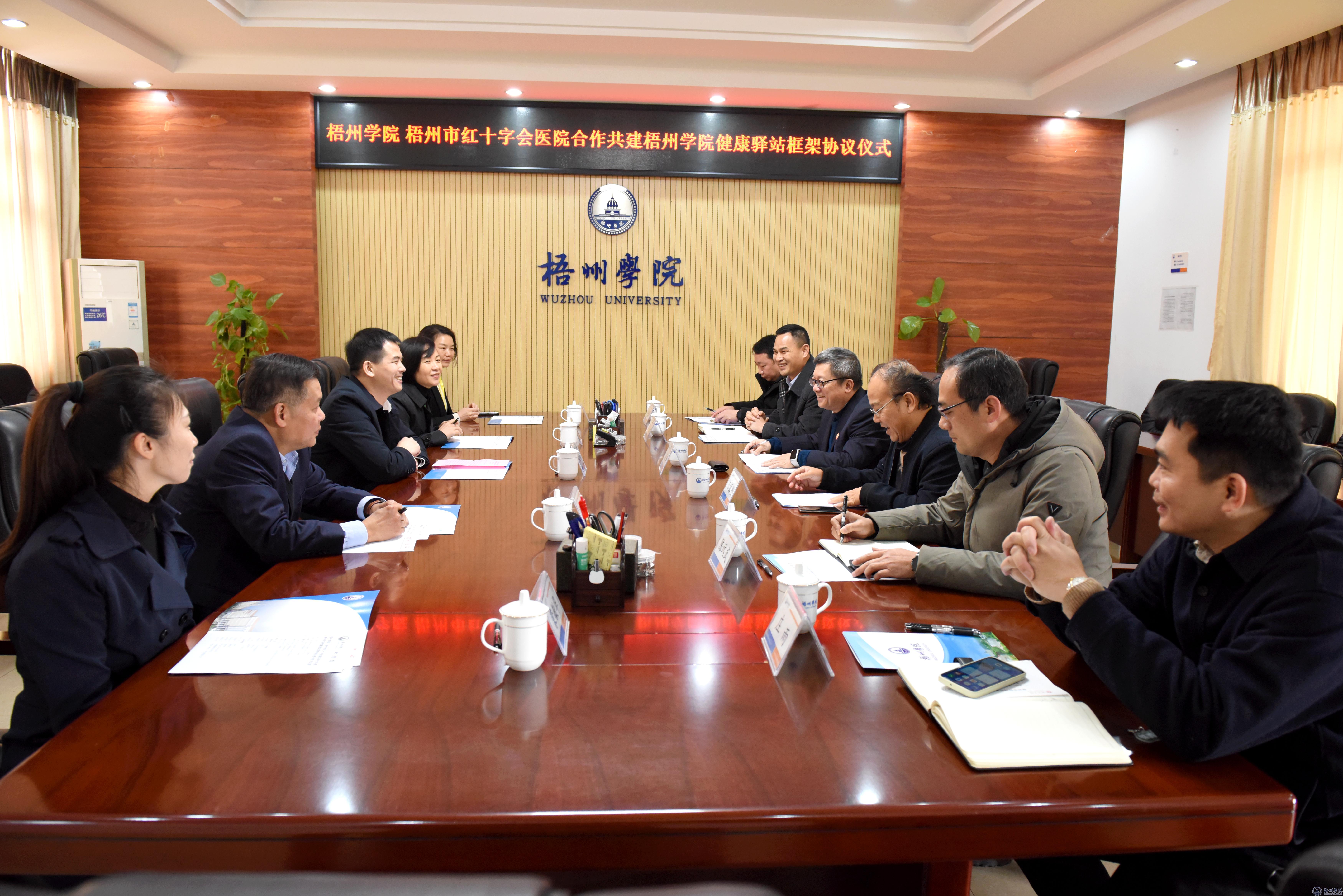 2月16日上午,我校与梧州红十字会医院共建健康驿站框架协议签约仪式在明理楼八楼第二会议室举行。梧州红十字会医院院长余永铭、党委专职副书记刘凤玲、副院长郑裕明、副院长李皓,我校校长杨奔、副校长玉振明、副校长范生汝出席签约仪式。签约仪式由我校副校长玉振明主持。