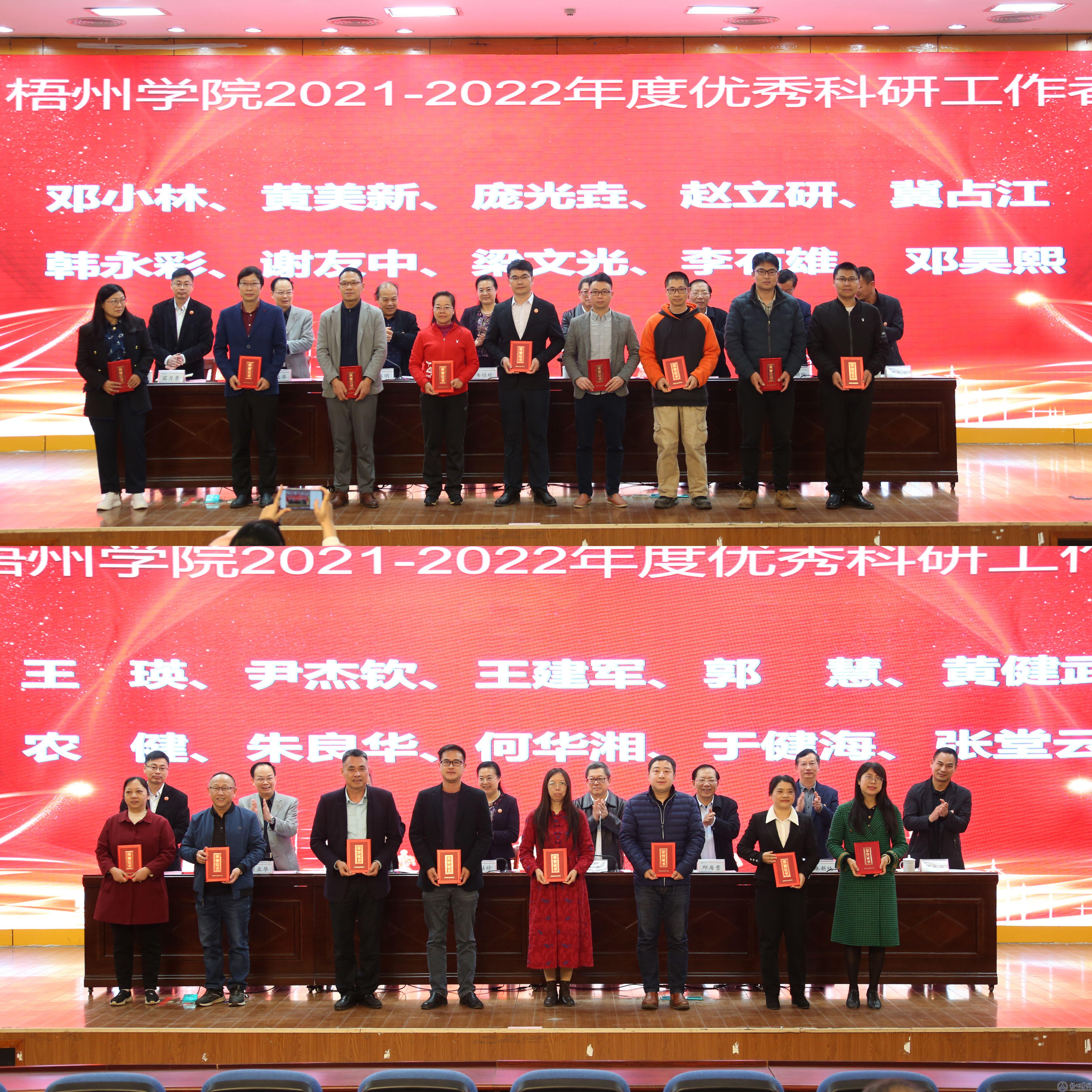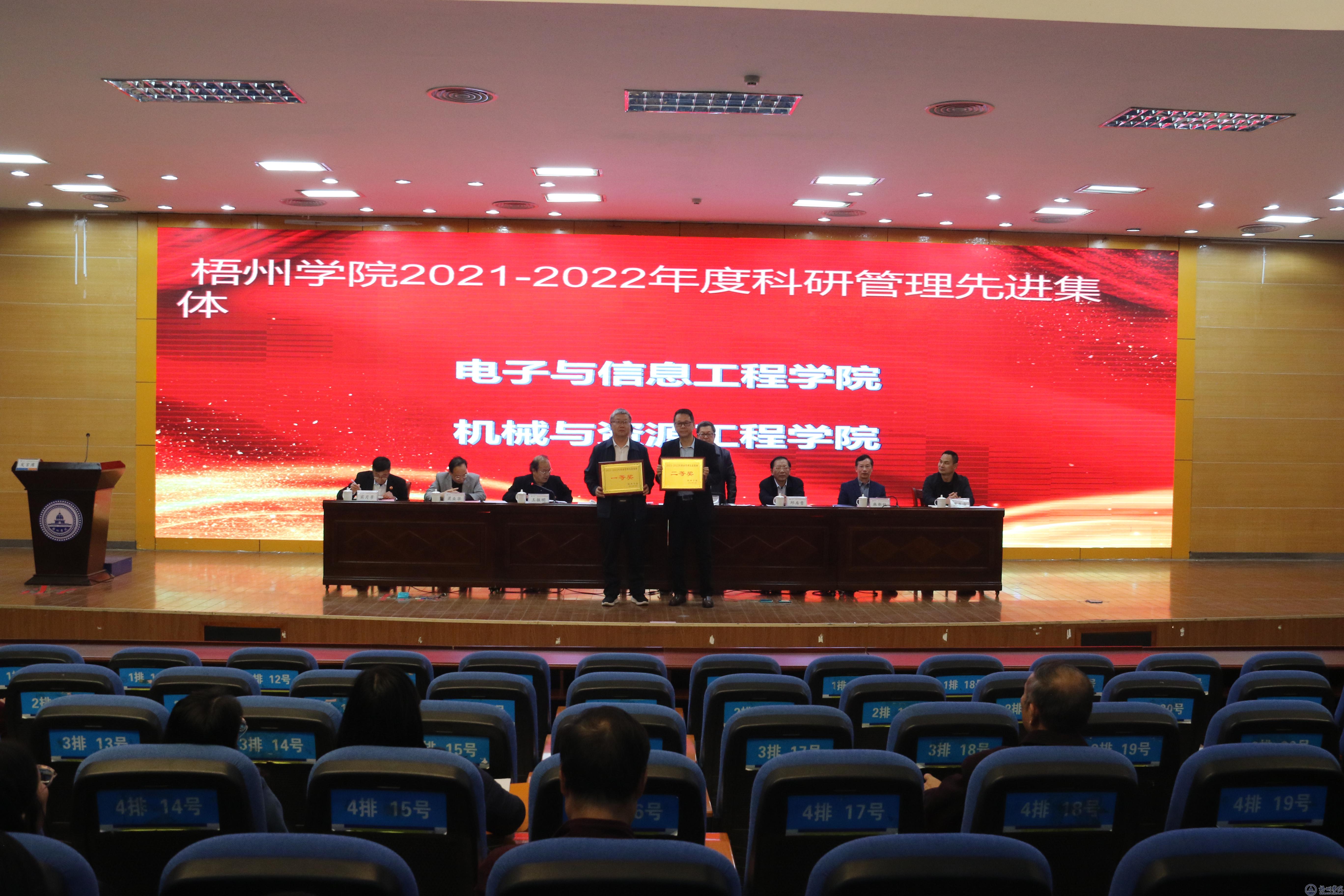 会议现场 麻新纯副校长宣读了《梧州学院关于关于表彰2021-2022年度科研管理先进集体和优秀科研工作者的决定》。学校领导为受表彰的集体和教师颁奖。