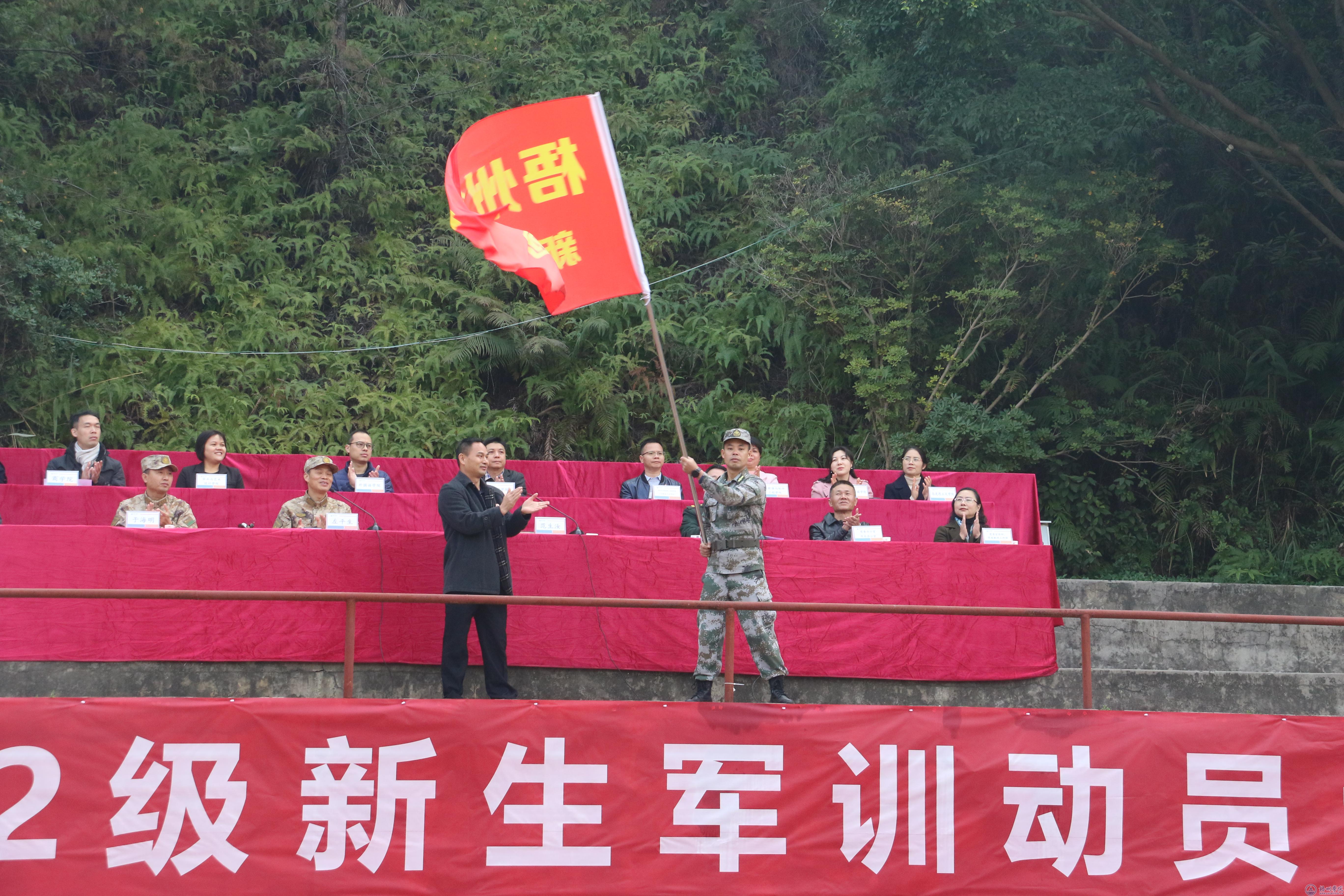 学校副校长范生汝为新生军训团授“梧州学院新生军训团团旗”。