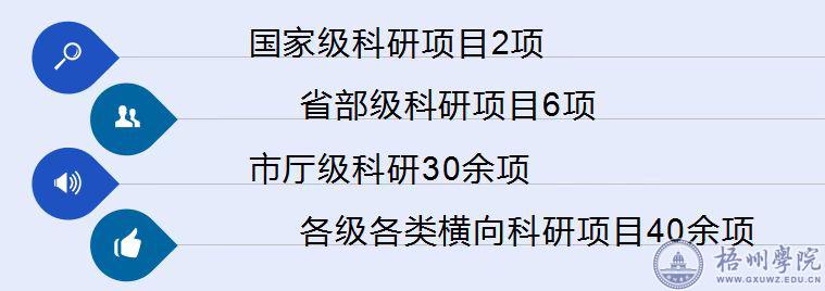 近年来,学院以国际商务硕士点建设为契机,放眼全球,进一步完善了科研管理、推进成果转化,学院在科研成果获奖、科研项目立项、高水平论文发表及服务地方经济建设等方面取得了显著成效。学院教师先后获得国家级科研项目2项,省部级项目6项,市厅级30余项,各级各类横向项目40余项,发表论文100余篇,其中核心论文20余篇。先后获得广西第十七次社会科学优秀成果奖2项,广西第十七次社会科学优秀成果奖著作类二等奖1项。