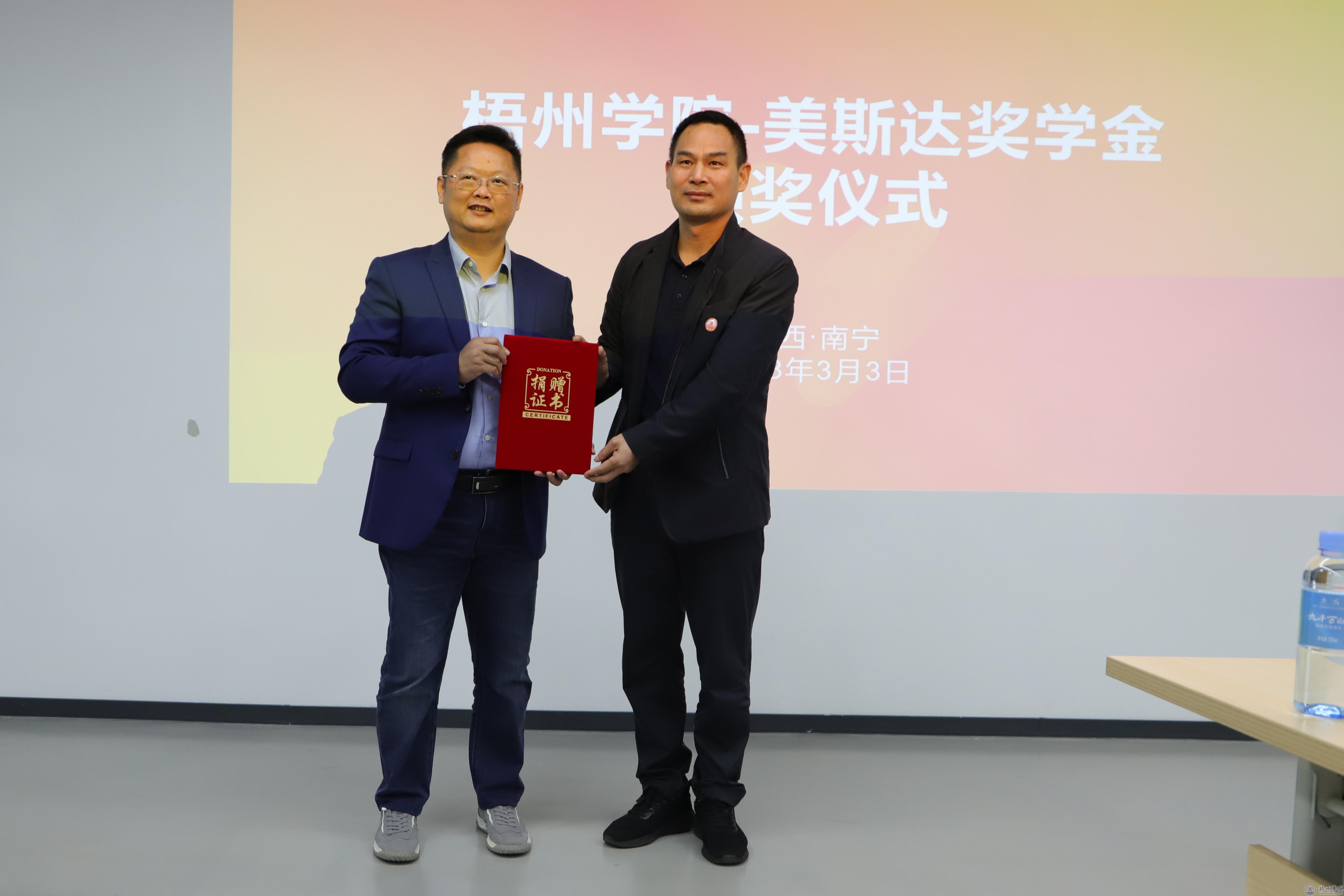 在“梧州学院—美斯达奖学金”颁奖仪式上,黄康华董事长代表美斯达集团接受了范生汝副校长颁发的捐赠证书,校企双方领导为获奖学生代表颁奖。范生汝副校长对美斯达集团长期以来关心支持我校教育事业发展、对黄康华等校友心系母校回馈母校的义举表示感谢,希望获奖学生代表将企业的关爱化作学习动力,学习了解企业的发展,开拓视野,努力学习,明晰职业目标,以优秀校友为榜样,心怀感恩,以青春之力量,谱写梧院学子之华章。