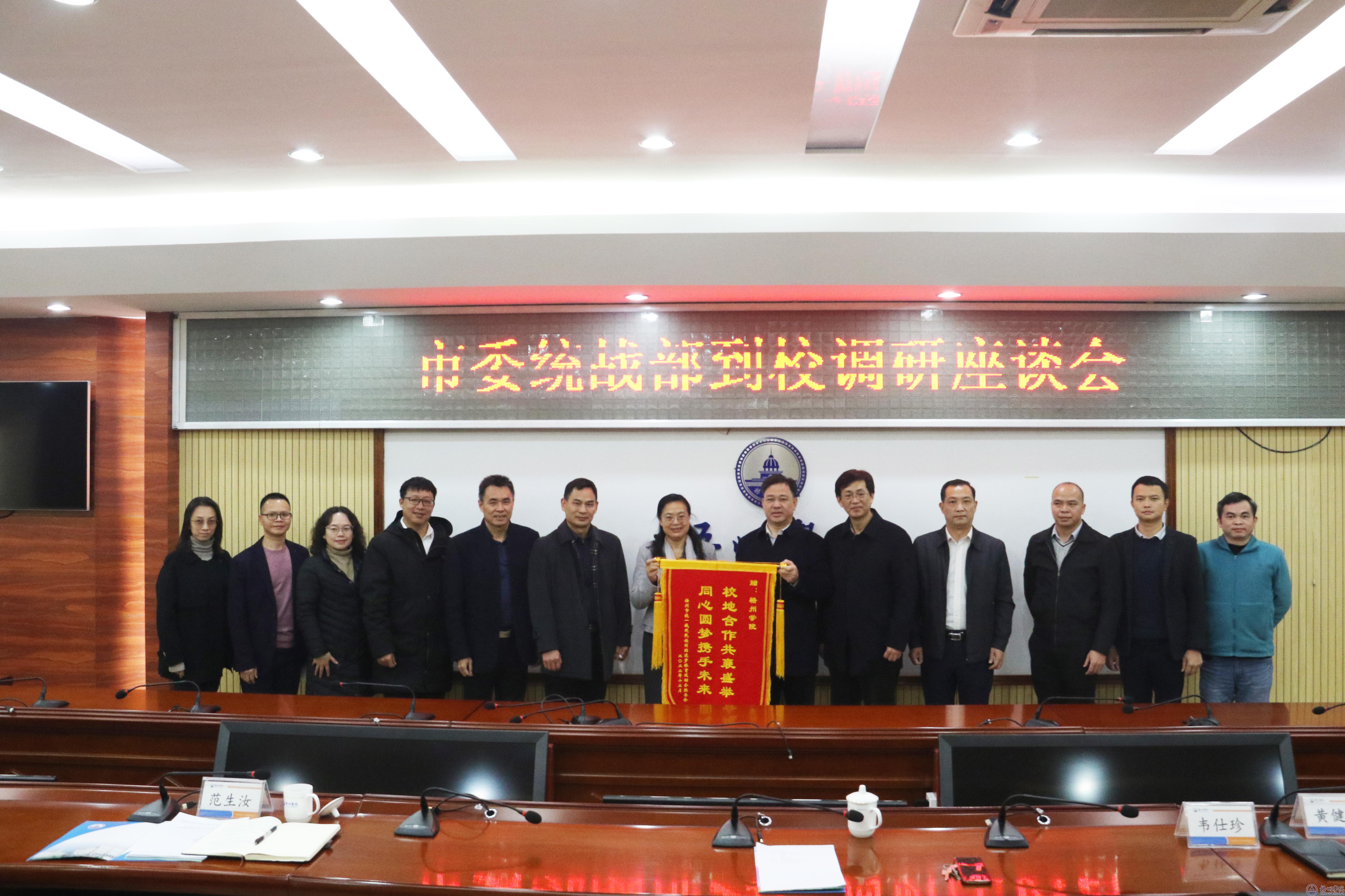 1月5日下午,梧州市委常委、统战部部长何世恰一行5人到我校座谈,并代表市统一战线民族团结进步体育运动会组委会赠送“校地合作共襄盛举 同心圆梦携手未来”锦旗。我校党委书记韦仕珍,党委常委、副校长范生汝,以及梧州市委统战部、我校党委统战部和运动会工作组相关负责人代表参加座谈会。