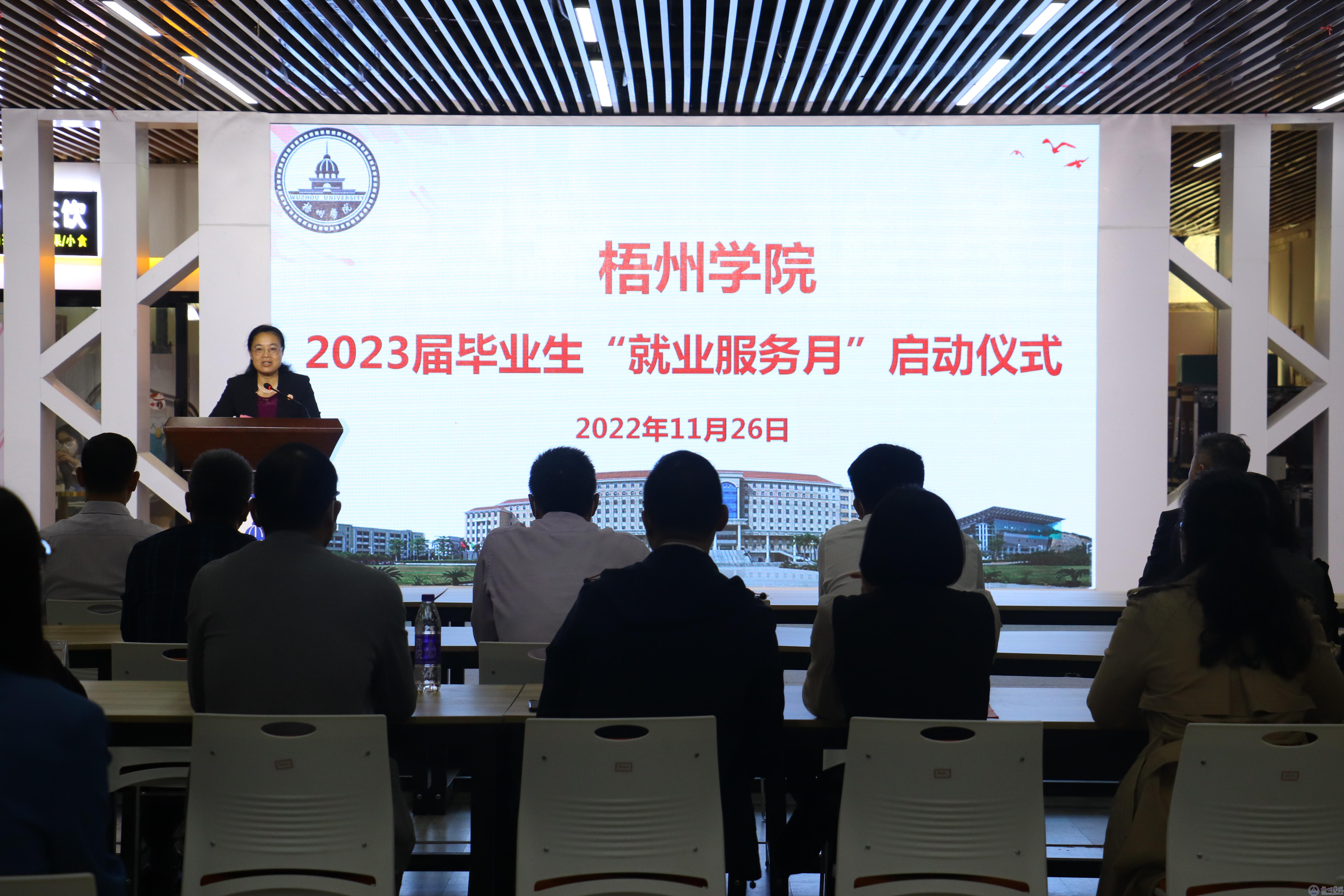 为深入贯彻落实党的二十大精神,落实党中央、国务院关于高校毕业生就业工作的决策部署和教育部办公厅关于开展2023届高校毕业生校园招聘月系列活动的要求,11月26日上午,学校在体育馆负一楼邑谷中心举行2023届毕业生“就业服务月”启动仪式。学校党委书记韦仕珍、副校长范生汝,梧州市人力资源和社会保障局副局长、党组成员徐斌出席启动仪式。启动仪式由学生工作部(处)部(处)长李德华主持。