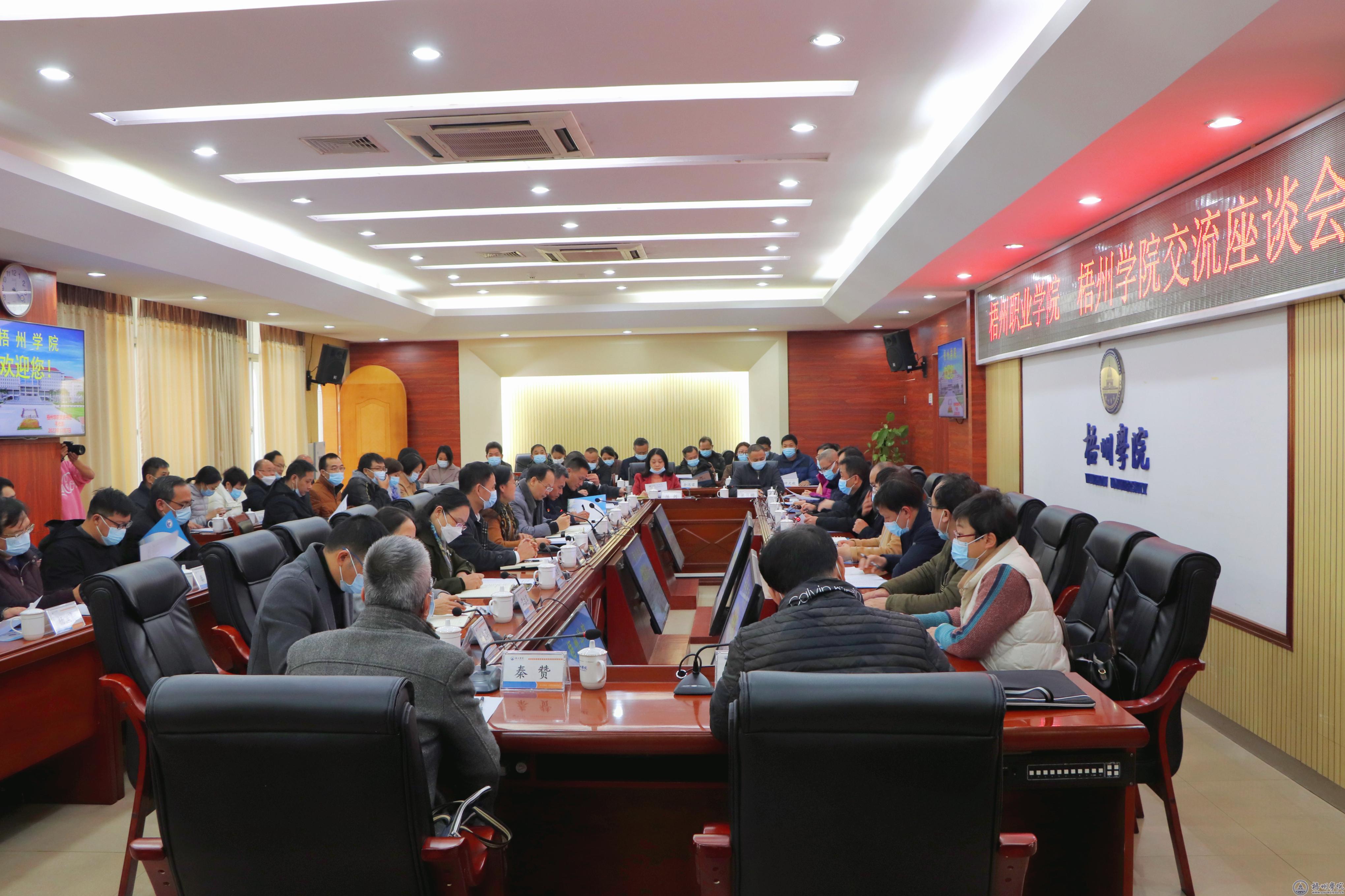 12月7日下午,梧州职业学院党委书记时伟率领导班子成员、各职能部门和各教学单位负责人到我校学习交流。梧州职业学院党委副书记、纪委书记赖浪涛,副校长李伟;我校党委书记韦仕珍,纪委书记梁业华,副校长玉振明、范生汝参加学习交流活动。