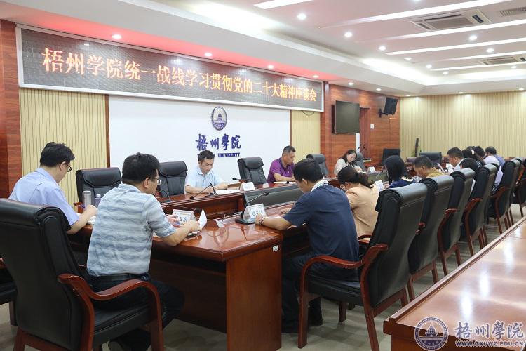 10月26日下午,我校在明理楼八楼第一会议室召开统一战线学习贯彻党的二十大精神座谈会。学校党委常委、统战部部长黄健武参加并主持会议。各民族党派,无党派人士,学校留联会,侨眷,少数民族,港台籍教师代表,以及党委统战部全体人员参加会议。