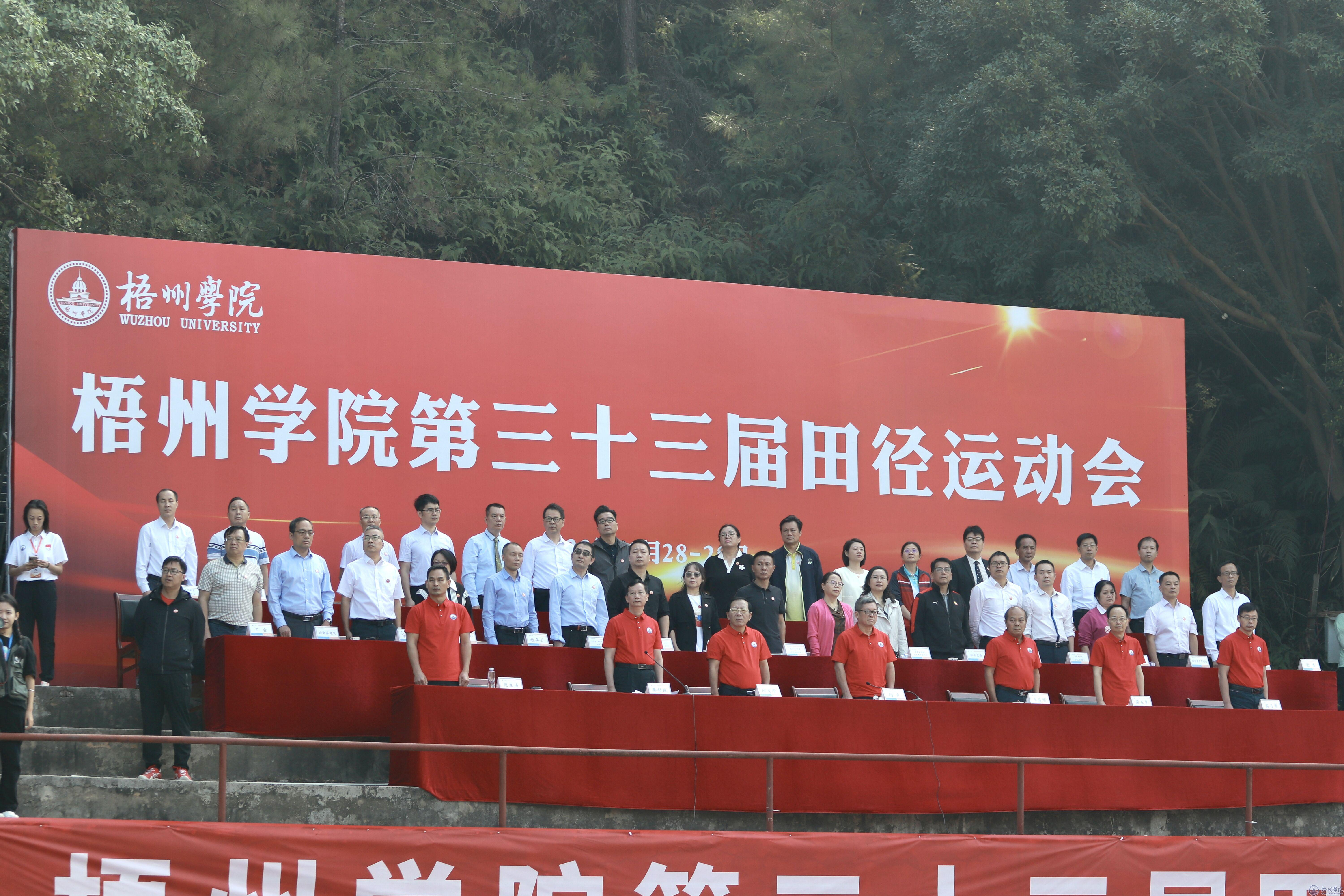 随后举行的升旗仪式中,护旗手迈着铿锵有力的步伐,依次升起中华人民共和国国旗、梧州学院校旗、梧州学院第三十三届田径运动会会旗。管乐队现场演奏梧州学院校歌、《歌唱祖国》等曲目。