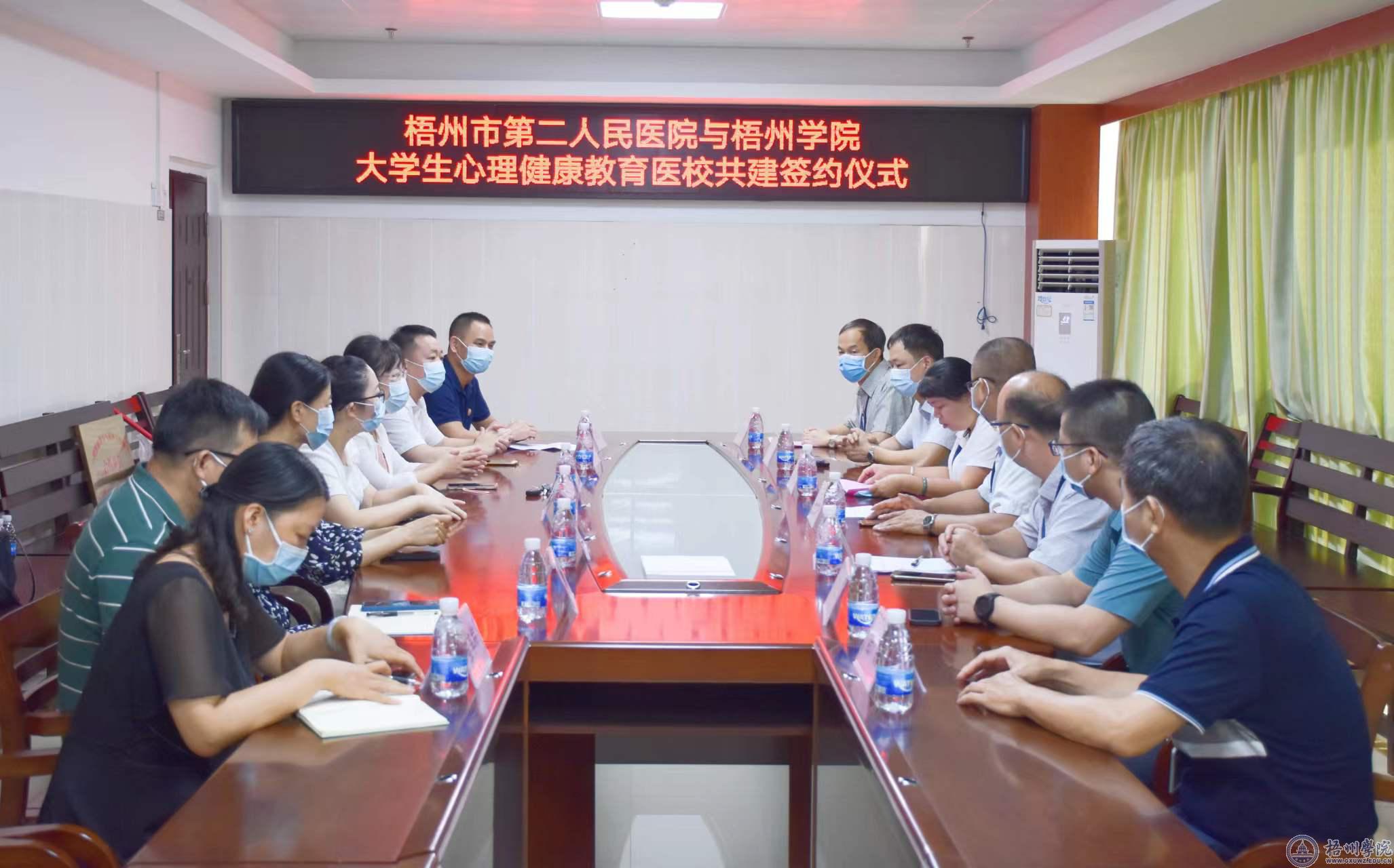 7月29日上午,我校与梧州市第二人民医院大学生心理健康教育医校共建签约仪式在梧州市第二人民医院会议室举行。活动由学生工作部(处)组织实施。