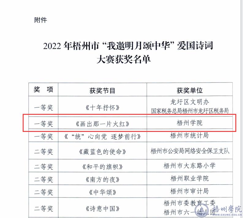 近日,我校党委宣传部报送的朗诵节目《画出那一片火红》在2022年梧州市“我邀明月颂中华”爱国诗词大赛中荣获一等奖。