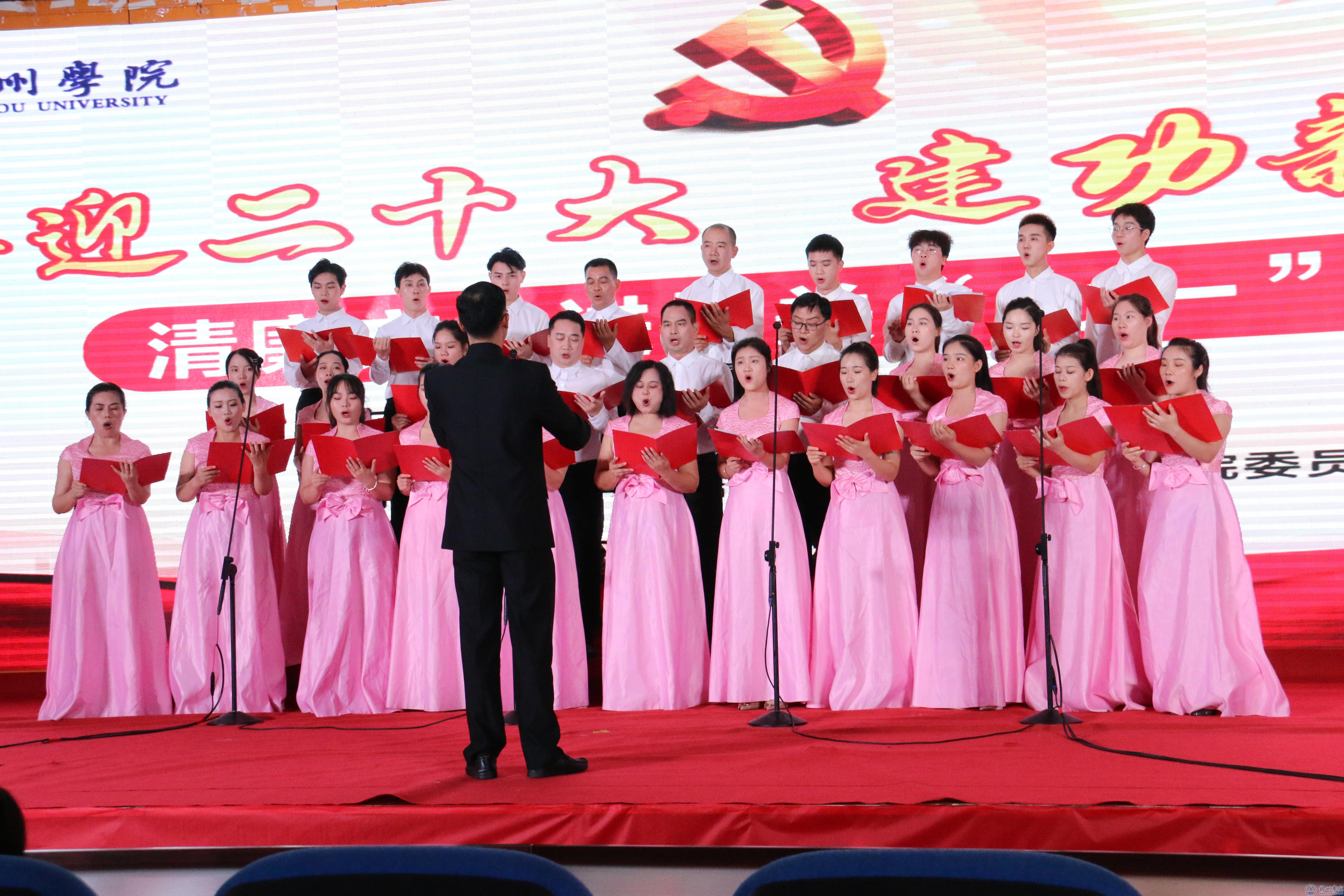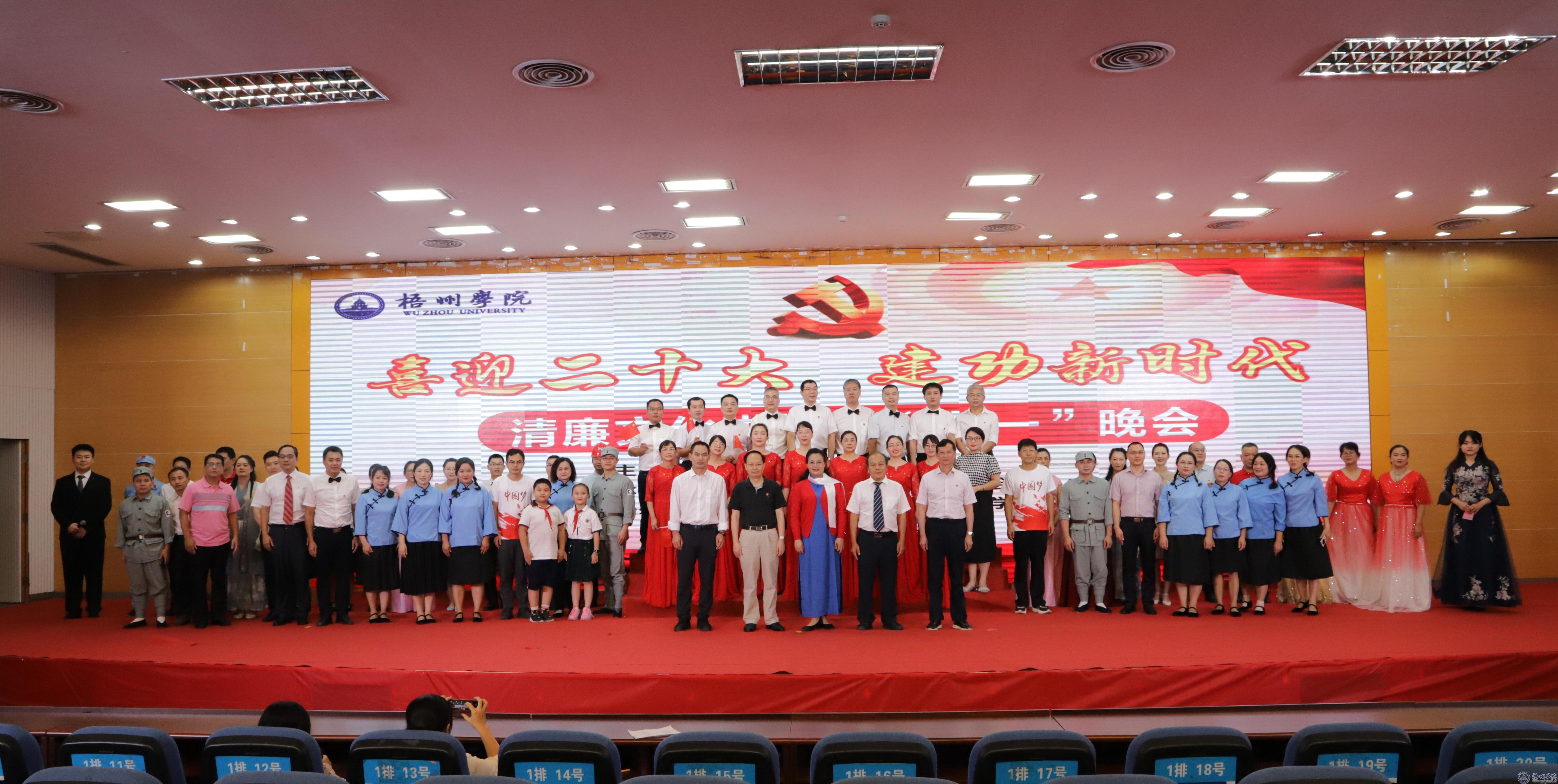 晚会节目形式多样,涵盖诗朗诵、小品、合唱、舞蹈等。财务处及发展规划处党支部的合唱《万泉河水清又清》展现了军民团结一家亲的动人景象;图书馆党支部的诗朗诵《中国梦》彰显了青年一代为国奉献的决心;校工会党支部的节目《映山红》表达了对红军的深深敬意;纪委办及宣传部党支部带来校园清廉题材小品《送“红包”》,节目以多次反转展现主人公廉洁奉公的教师形象;学工团委党支部带来小组唱《因为信仰》,以信仰之光引领前行之路;国际交流处党支部的节目《品典说廉》以中英双语的形式朗诵廉政诗词,讲述清官廉吏故事;组织统战党支部小组唱《记住你》融入壮族音乐元素“过山腔”,表达了对革命先烈的崇敬和思念之情;党办院办党支部节目《夸夸咱们大梧院》巧用“三句半”的民间曲艺表演形式展现学校的发展成果;人事处党支部的诗朗诵《我为党旗唱支歌》饱含对党的深厚情感;保卫处及继续教育学院党支部的合唱《中国人》唱出了植根于国人心中的骄傲和自豪;后勤基建处党支部的诗朗诵《后勤梦·梧大梦·中国梦》以点带面,将后勤工作与学校、国家发展紧密结合;机关党委嘉宾带来特别节目《绣红旗》,演员们一针一线细致缝制红旗的过程正如国家的悉心培养,满怀对祖国的感激之情;现代教育技术中心党支部带来配乐朗诵《祖国赞》,向有着五千年文明的祖国表达赞美之情;教师教育学院党委带来特别节目《芳华》,舞蹈演员以曼妙的舞姿再现青年士兵的峥嵘岁月;教务双创党支部、科研处党支部和国资审计党支部合唱《共和国之恋》,表达对广大科技工作者的崇高敬意及科技报国的决心。
