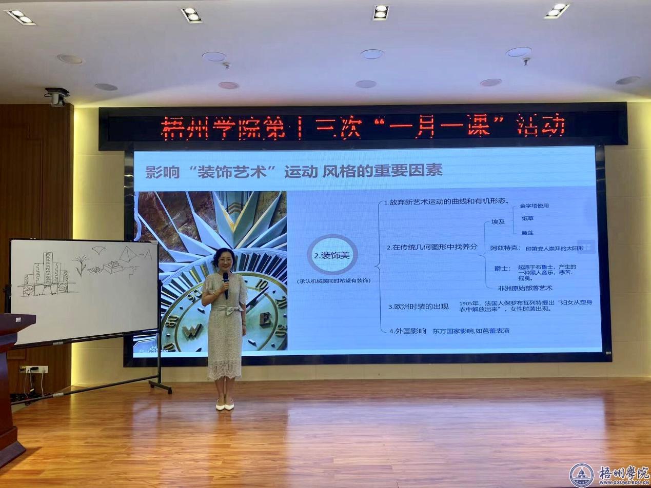 本次活动由宝石与艺术设计学院吴薇老师给学生上现场示范课,她授课的题目是《装饰艺术运动》。课程主要采用问答和引导的方法,阐述了装饰运动时期的建筑造型及色彩运用的主要特点,以及时代气息与传统文化对设计产生的影响,并通过国内建筑设计的典型案例,引导同学们思考何以将中国本土文化融合运用到设计中来,从而在文化延续的探索中得到启发。