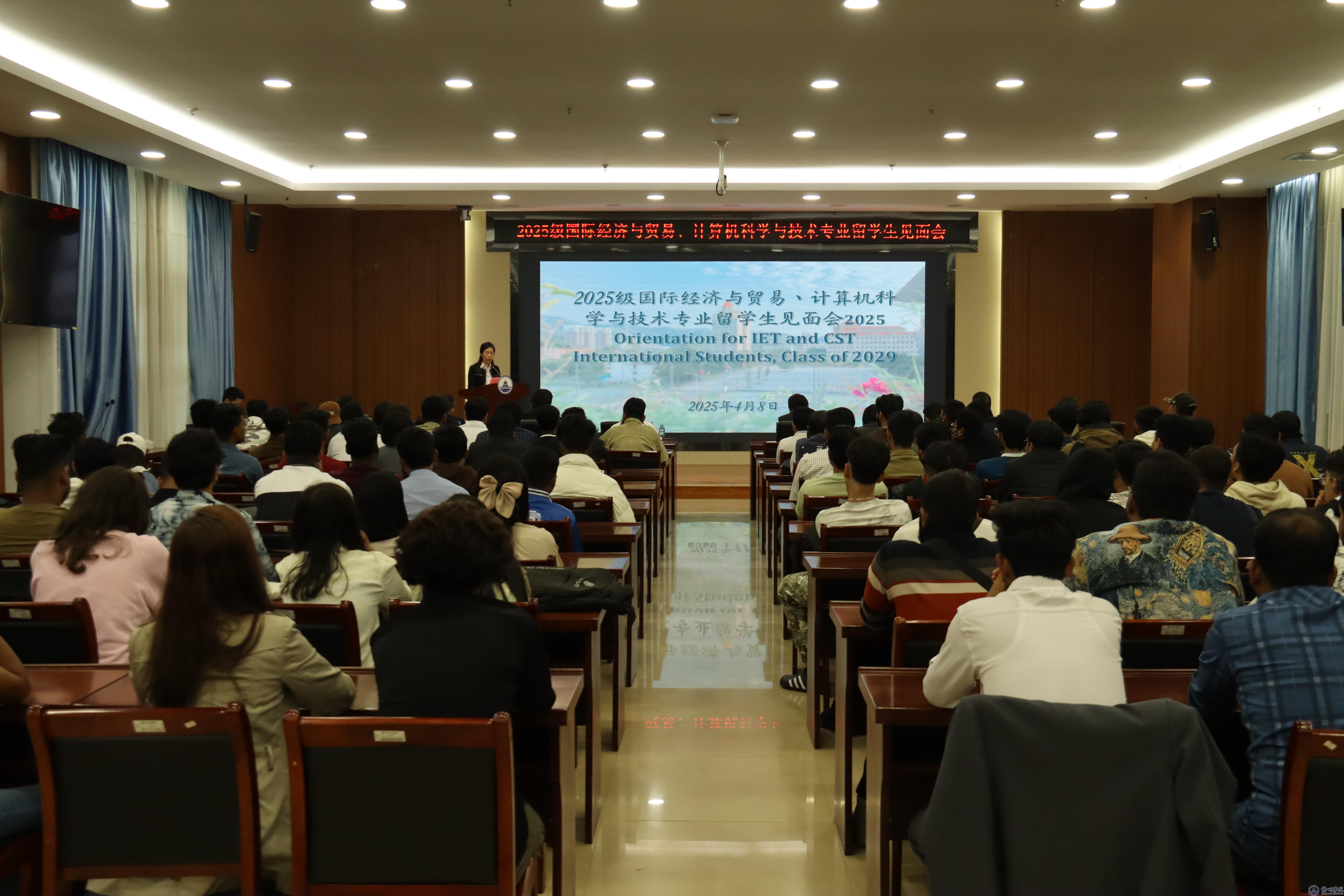 4月8日,2025级国际经济与贸易、计算机科学与技术专业留学生见面会在明科楼报告厅举行。学校党委常委、副校长莫晨宇,国际交流处、经济学院、大数据与软件工程学院负责人、教师代表与96名新生参加会议。
