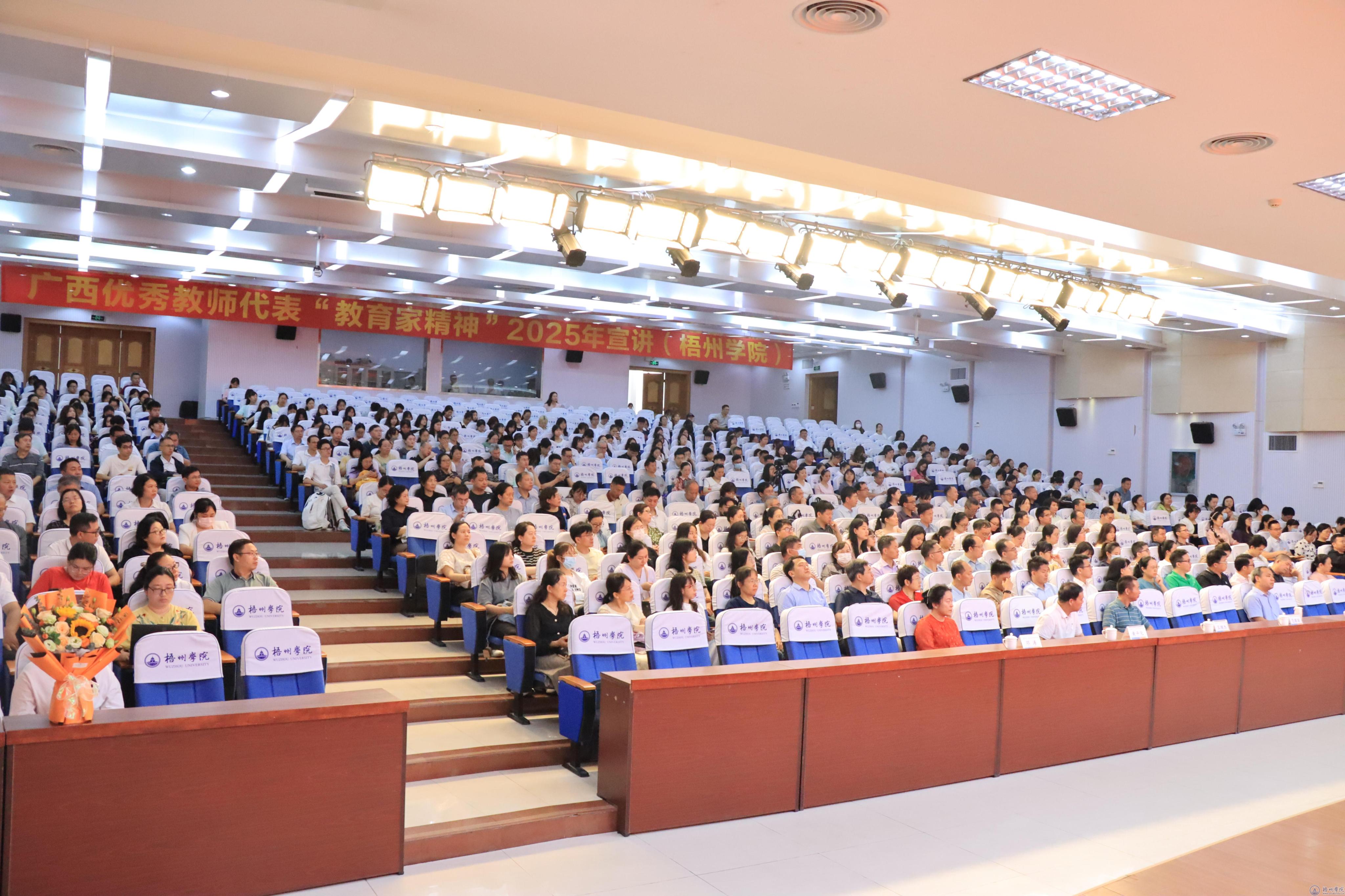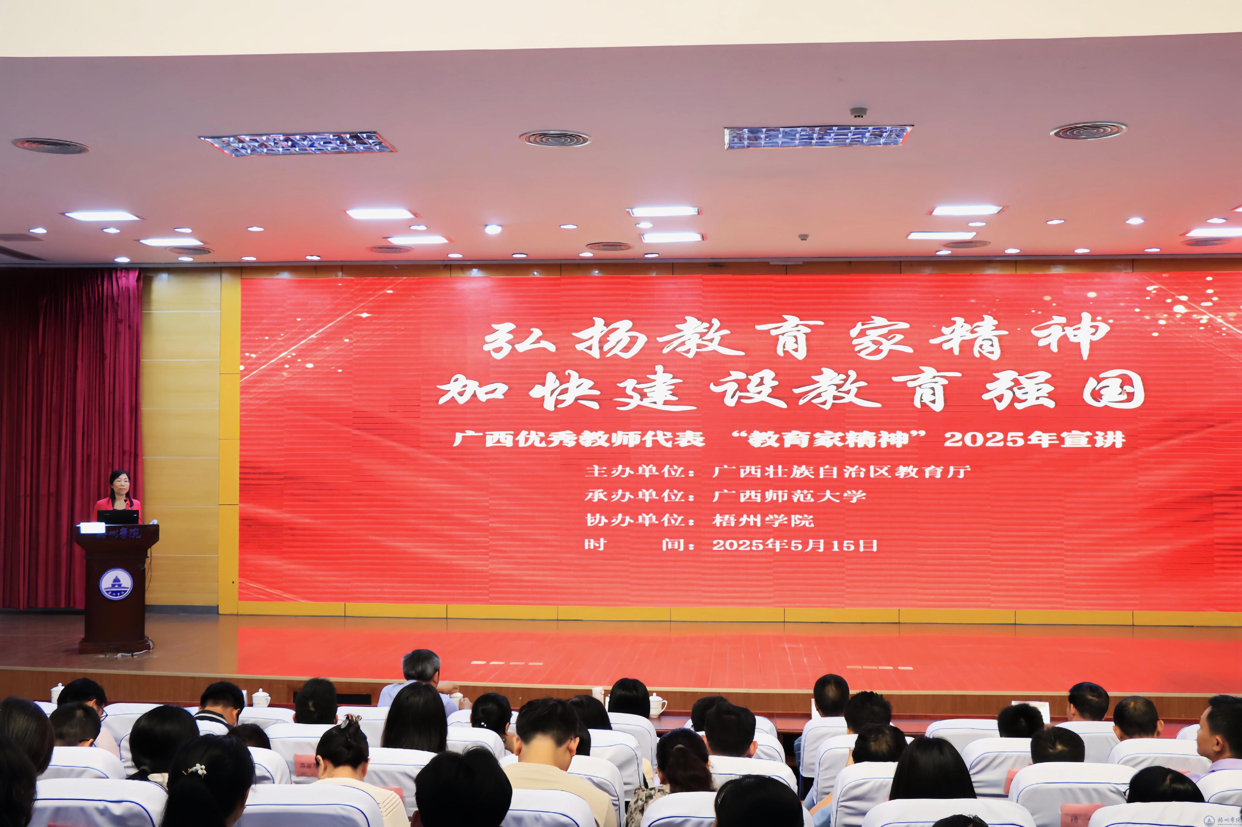 为深入贯彻落实习近平总书记关于大力弘扬教育家精神的重要指示,推进教育家精神铸魂强师行动。5月15日上午,我校在明理楼一楼学术报告厅举办广西优秀教师代表“教育家精神”2025年宣讲报告会。学校副校长莫晨宇出席会议,广西师范大学教务处相关负责人,梧州职业学院师生代表、梧州市中小学师生代表,以及我校各部门各部门二师生代表参加会议。会议由副校长莫晨宇主持。