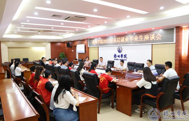 6月21日下午,学校在明理楼第一会议室召开梧州学院2022届基层就业毕业生座谈会。学校党委常委、副校长范生汝与即将或已经在基层就业的27名毕业生代表围绕“责任与梦想,服务与奉献”主题面对面座谈。