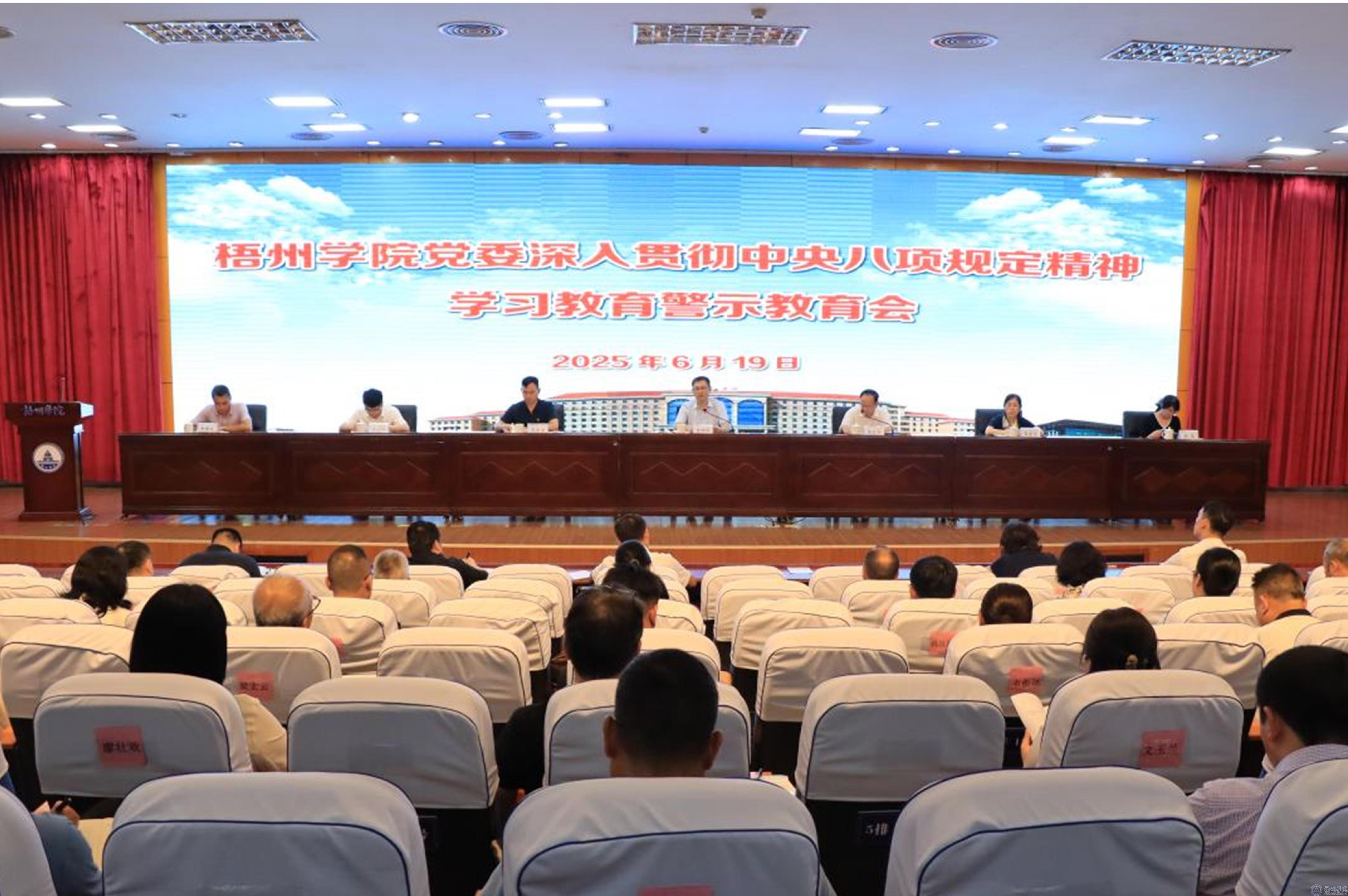 6月19日,梧州学院党委召开深入贯彻中央八项规定精神学习教育警示教育会。会议采取现场警示教育与集中警示教育相结合的方式,分两个阶段进行。全体校领导、中层干部、统一战线教师代表参加。