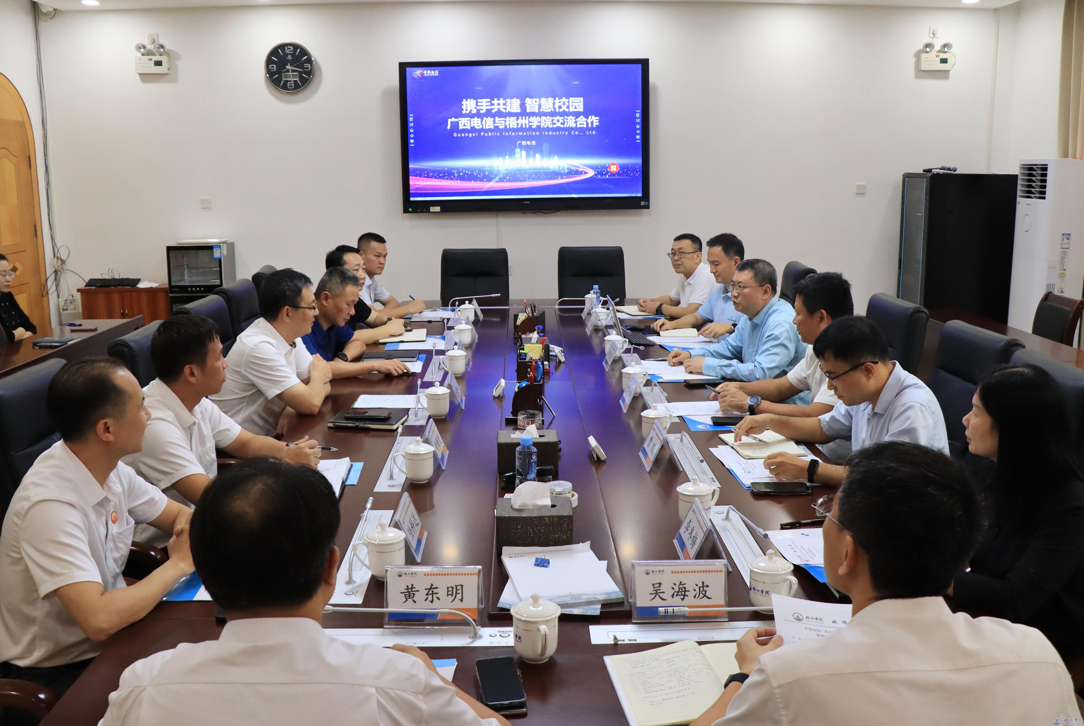 中国电信广西公司云中台(政企业务交付运营中心)、信产公司(云计算中心)、教育卫健事业部、梧州分公司相关负责人,我校党委(校长)办公室、学生工作部(处)、现代教育技术中心、电子信息与人工智能学院相关负责人参加座谈交流。