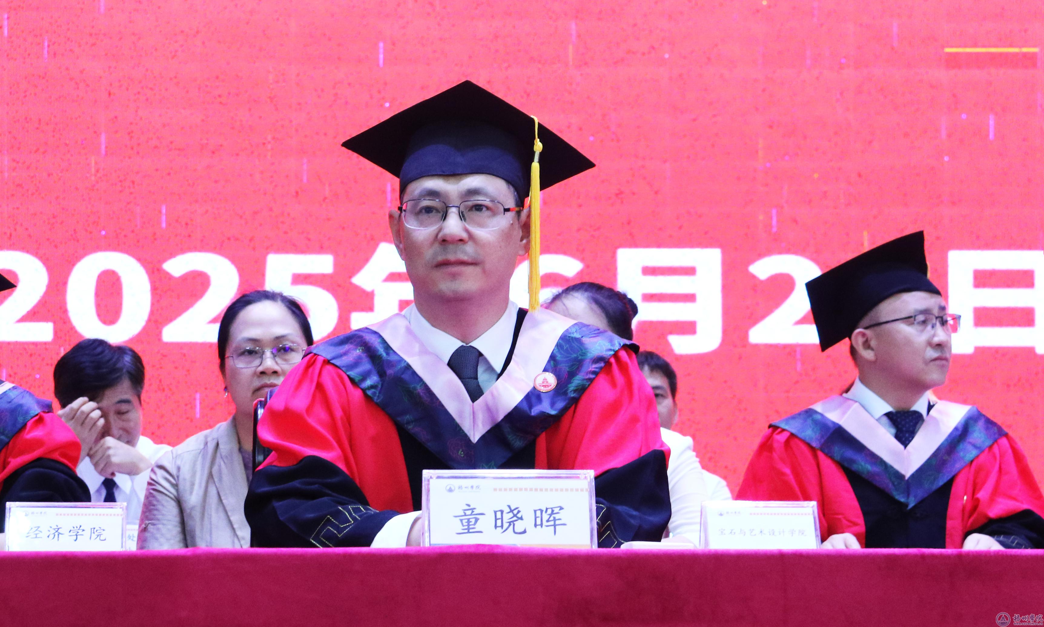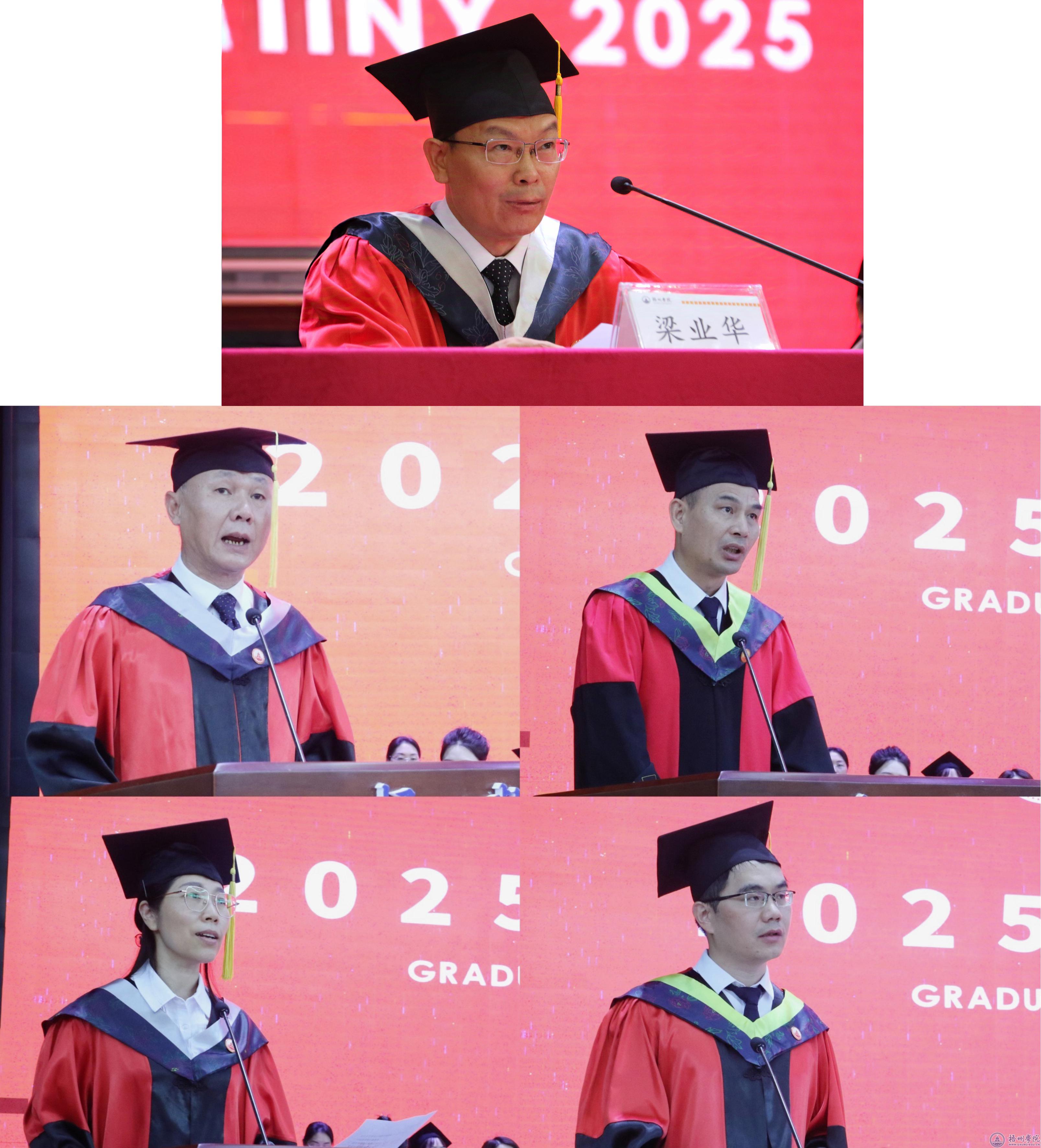 法学院2021级法学1班梁海润代表2025届毕业生发言,他回顾了四年大学的生活点滴,感恩母校悉心栽培,并表示将会把校训内化外行,在青春奋斗中立身赋能、笃行致远。食品与制药工程学院教师石金娥代表教师发言,她勉励广大毕业生踔厉奋发,在祖国大地书写奋斗新篇章。我校2017级视觉传达设计专业毕业生裴一凡代表我校毕业校友发言,她深情回顾了从事壁画工作的历程,感恩母校、师长们的谆谆教诲,激励毕业生找寻热爱、脚踏实地、行稳致远。