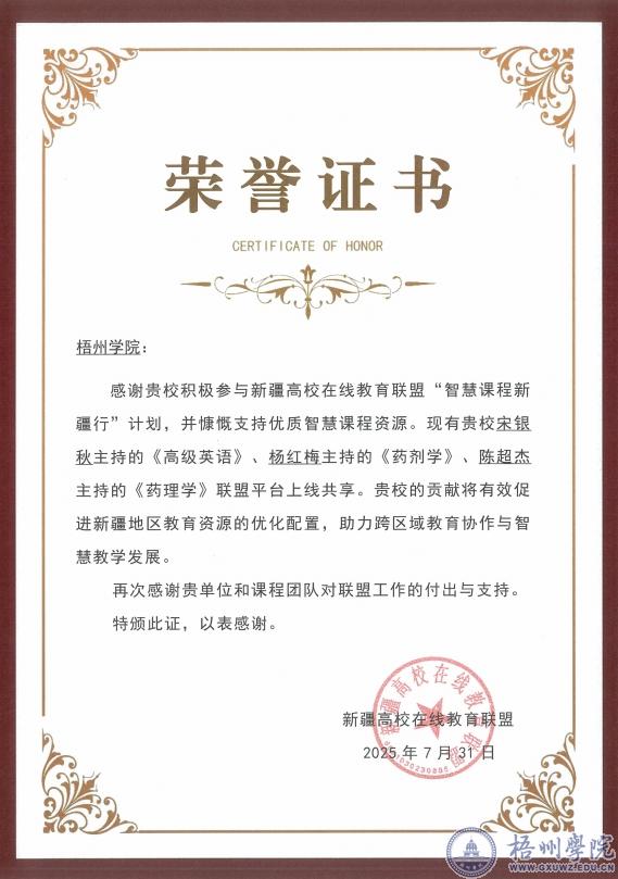 近日,学校收到来自新疆高校在线教育联盟的荣誉证书,表彰学校在“智慧课程新疆行”计划中作出的积极贡献。宋银秋教授主持的《高级英语》、杨红梅教授主持的《药剂学》、陈超杰教授主持的《药理学》三门优质智慧课程成功在联盟平台上线共享,为新疆地区教育资源优化配置注入“梧力量”。