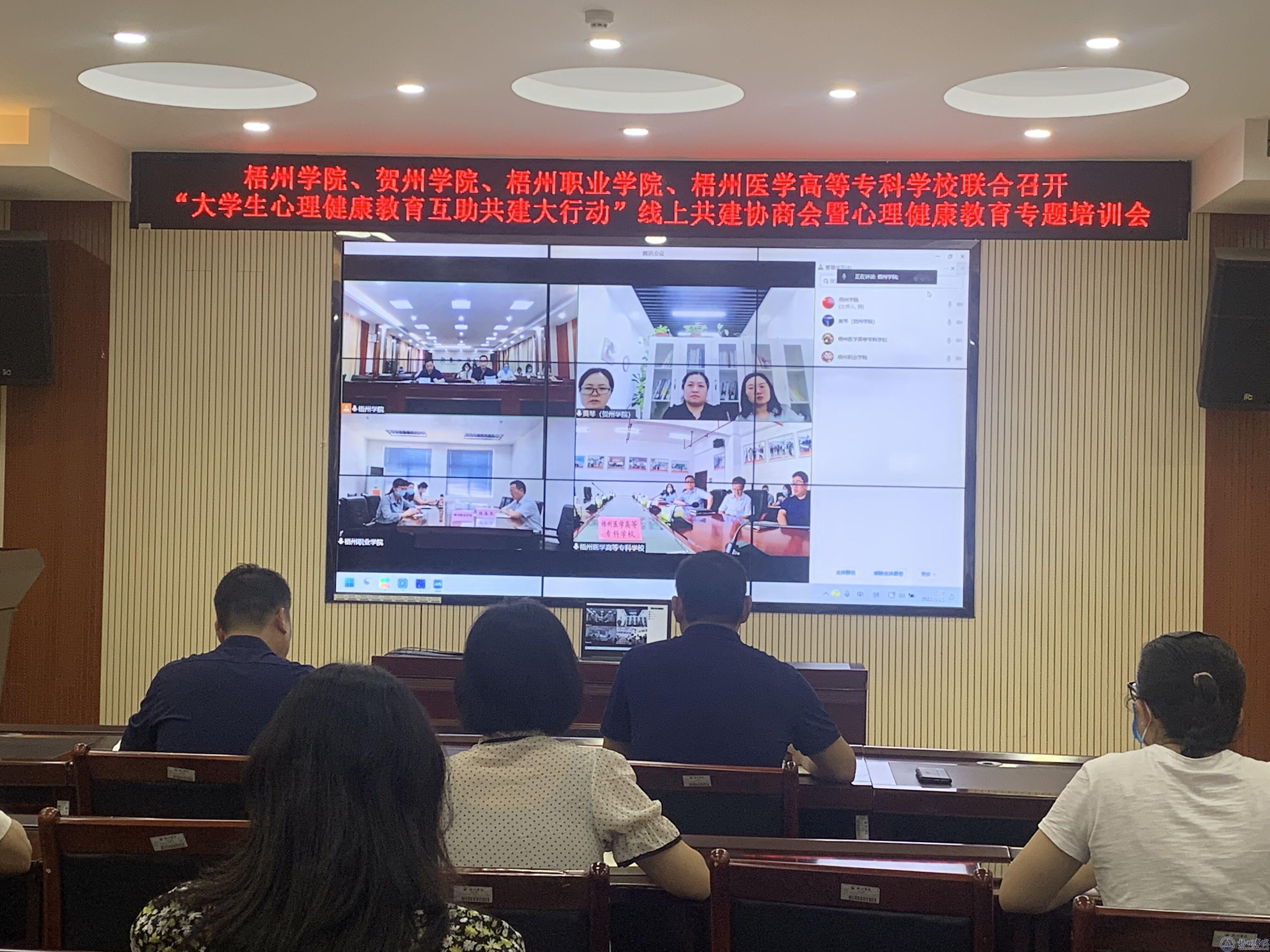 5月25日下午,我校与贺州学院、梧州职业学院、梧州医学高等专科学校联合召开的“大学生心理健康教育互助共建大行动”线上共建协商会暨心理健康教育专题培训会在明理楼七楼视频会议室举行。梧州职业学院校长、党委副书记陈森英,梧州医学高等专科学校常务副校长邱铁钢,贺州学院学生工作处副处长陈丽彬等共建高校领导及心理教育专家和老师参加了会议。