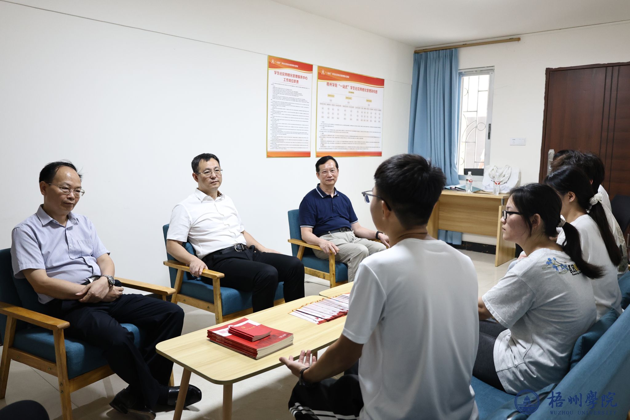 校领导走进A5经济学院宿舍网格化管理办公室,与来自管理学院、食品与制药工程学院、电子信息与人工智能学院、机械与资源工程学院的新生代表座谈交流并为他们送上慰问品和慰问金。新生代表们逐一汇报自己的学习经历、家庭情况及未来规划。校领导一边认真听取同学们的发言,一边与大家亲切交流,现场氛围热烈而温馨。童晓晖书记勉励同学们珍惜人生中非常宝贵的大学时光,认真规划好、发展好大学学习生活;在认真学习理论知识的同时,积极主动参与第二课堂等社会实践锻炼,不断提升综合素质;在平衡学业与家庭责任的同时,积极履行社会责任,度过一个愉悦而满是收获的大学时光。