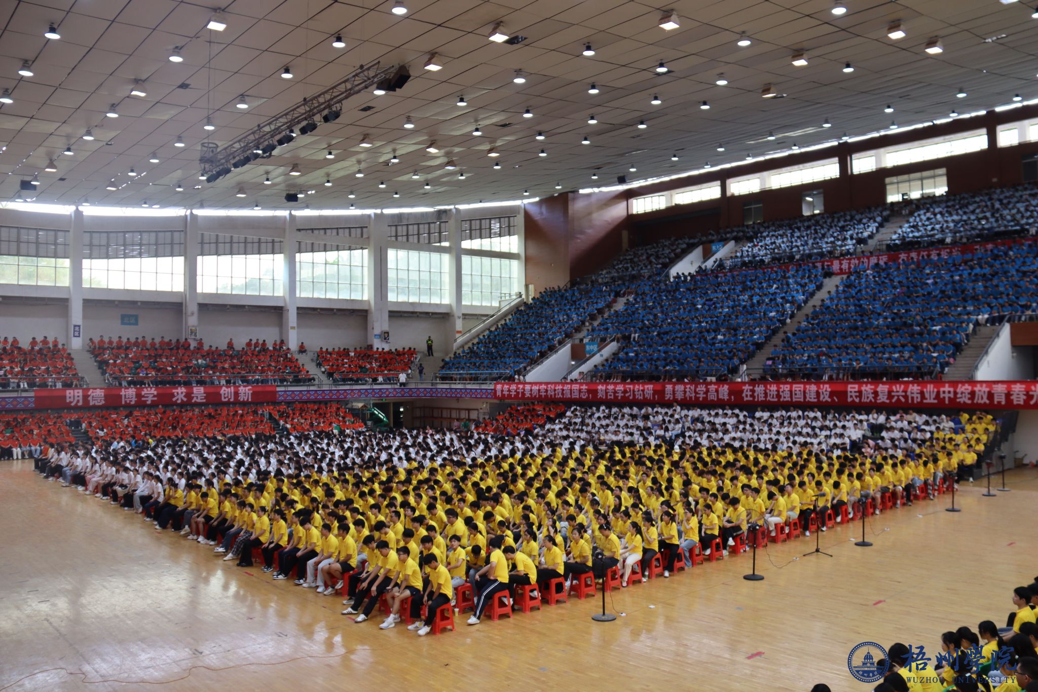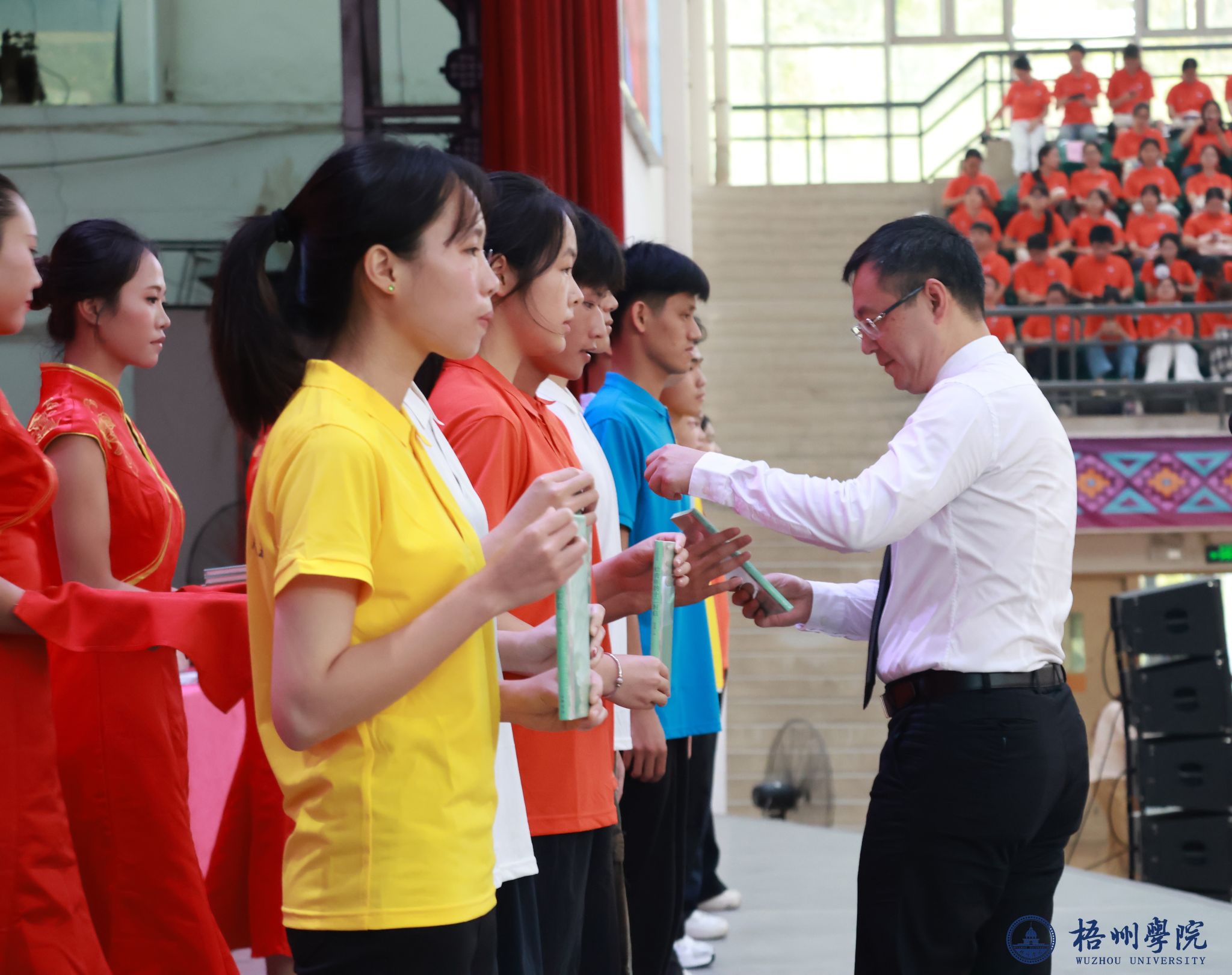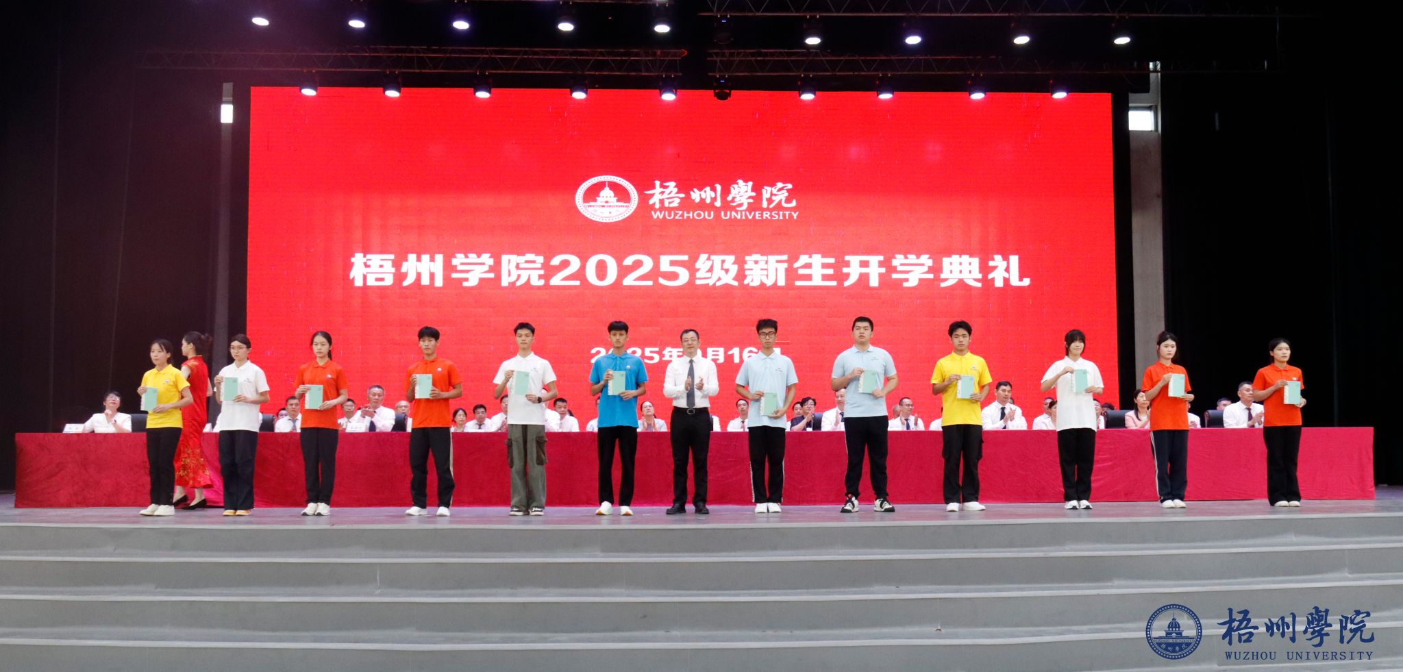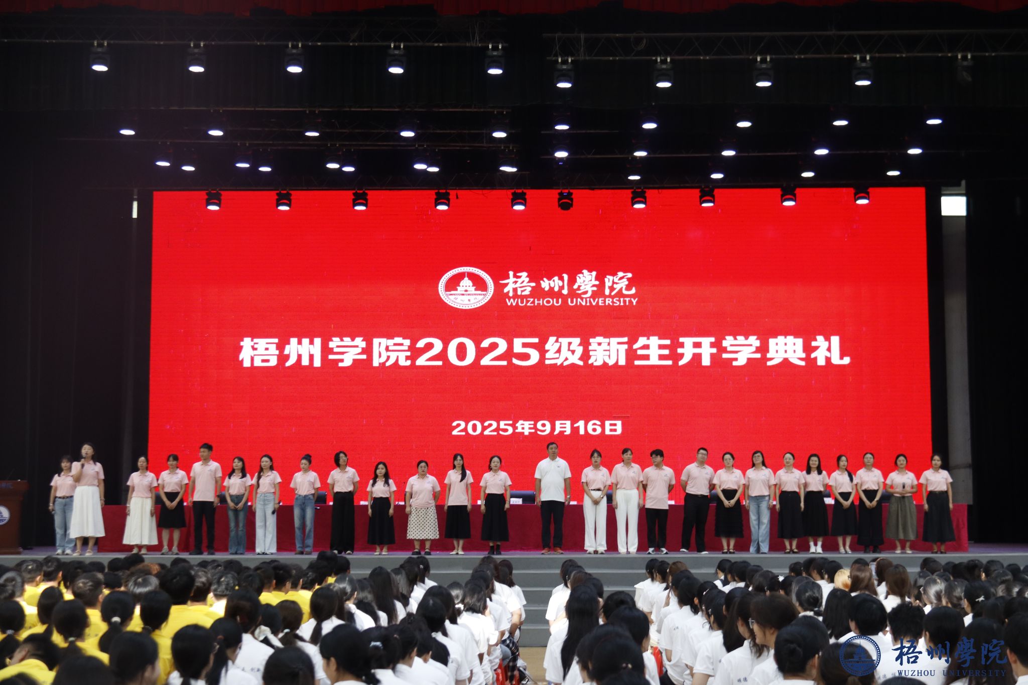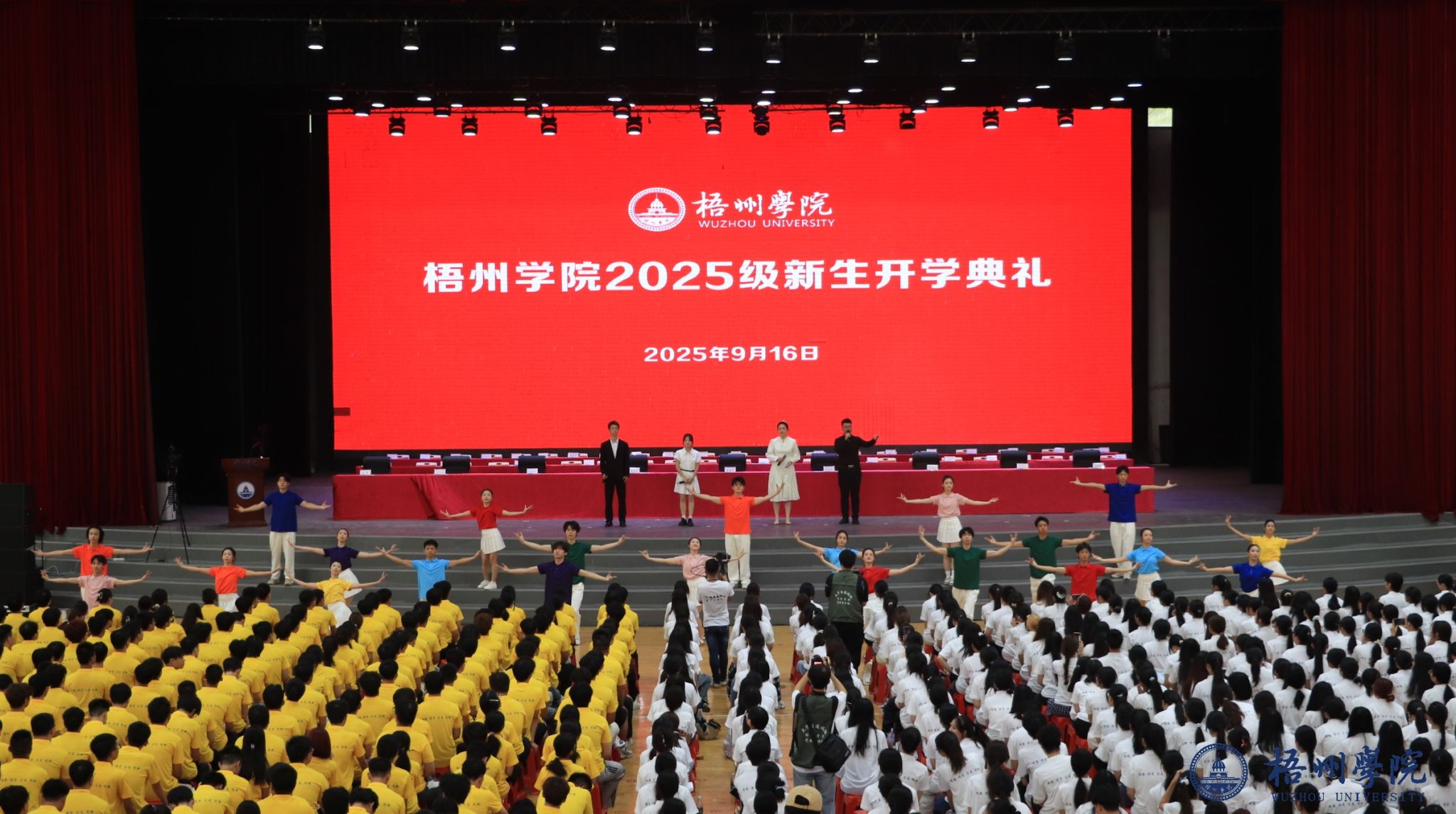 典礼开始前,26名新生辅导员深情演唱《和你一样》,温柔歌声传递着陪伴与守护的初心,瞬间拉近了与新生的距离;学校啦啦操队身着靓丽服装,手持五彩花球跳起活力啦啦操,灵动舞姿与整齐节拍点燃全场气氛;2025级新生代表演唱梧院版《南山南》,改编的歌词里满是对校园的热爱与期许,青涩嗓音中藏着青春力量;师生携手带来歌舞《强国一代有我在》,嘹亮歌声与昂扬舞姿彰显着新时代青年的担当,引发全场共鸣。期间,优秀校友杜帅帅通过视频送来祝福与礼物,真挚情谊与励志故事为新生注入前行力量。