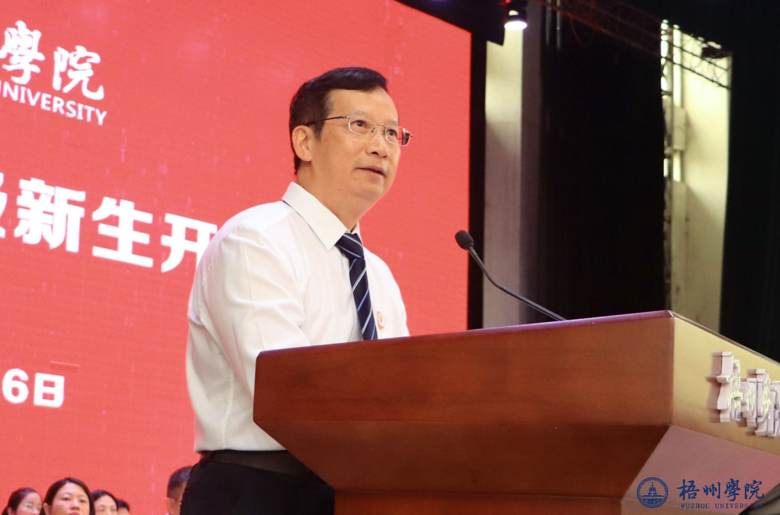 文学与传媒学院2022 级新闻学专业宋佳轩分享学业与实践心得,从家国担当、专业创新、全面拓界三个维度寄语新生逐梦成长;经济学院 2025 级国际经济与贸易专业郭星佐畅谈入校感受,讲述选择专业的初心,与同窗约定做好成长“接力”,彰显为国贡献的志向。教师教育学院黄懿老师阐释大学育人真谛,寄望新生成长为时代担当者;校友代表莫智帆回溯在校时光与创业历程,分享成长感悟并祝愿新生书写梧院新篇章;新生家长代表粟爱媛讲述家庭与梧院的渊源,点赞学校发展成果,叮嘱孩子珍惜时光,更表达了家校共育、助力孩子为国奉献的决心。