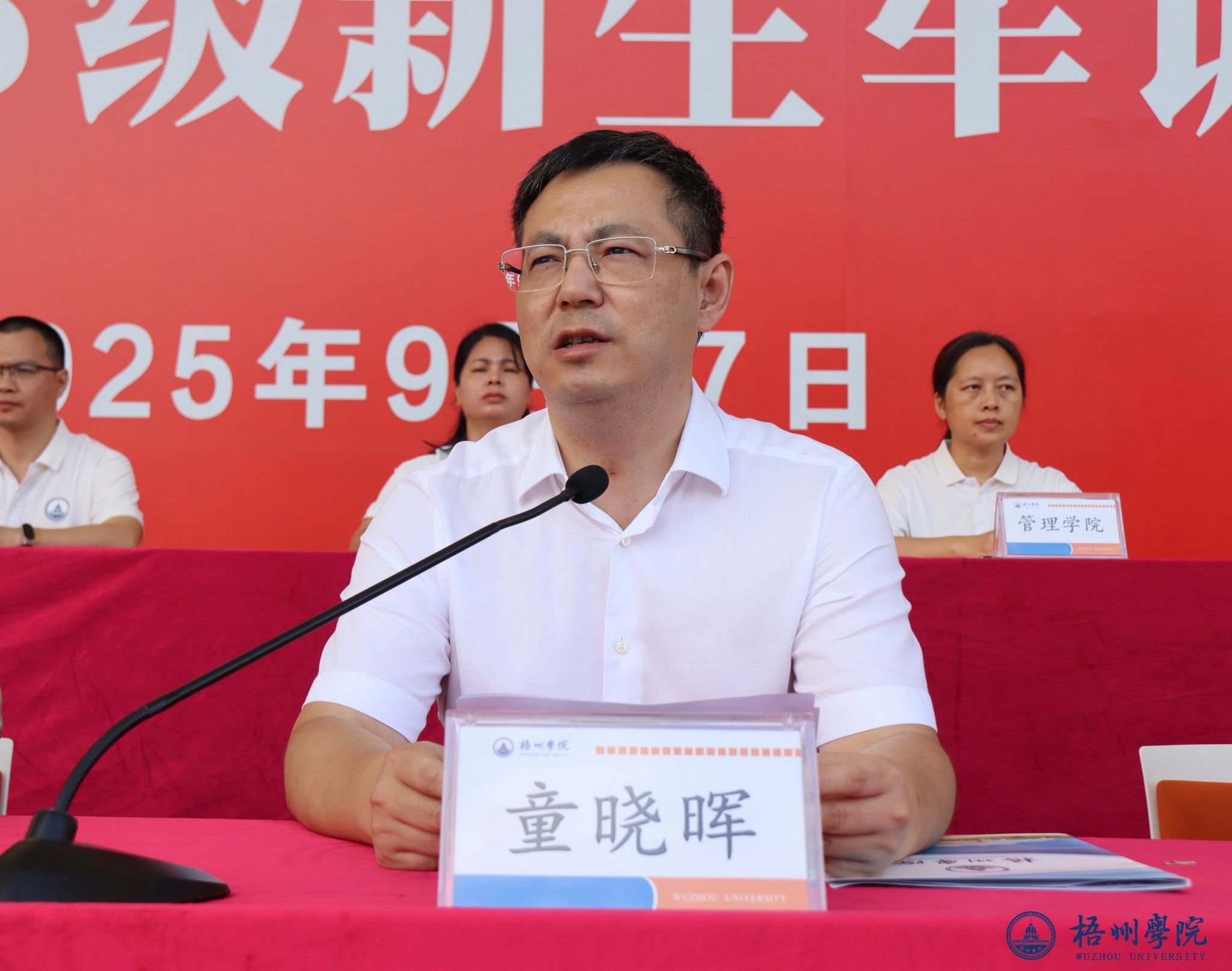 学校党委书记童晓晖作动员讲话。他强调,“国无防不立,民无防不安”,军训既是青年学子接受国防教育、厚植家国情怀的核心课堂,更是传承抗战精神、践行使命担当的实践起点。针对本次军训,他希望2025级新生们以史为鉴铸忠诚,深入感悟国防历史与抗战精神,将家国情怀根植于心、外化于行;以苦为砺强意志,在烈日骄阳与队列训练中磨砺坚韧品格,练就不怕困难、迎难而上的毅力;以合为贵聚力量,在集体训练与协作任务中凝聚向心力,培育互帮互助、团结奋进的团队精神。“希望梧院学子能将军训中淬炼的钢铁意志、优良品格与团结精神,切实转化为勤学笃行的内生动力,”童晓晖寄语新生,“努力成长为有理想、敢担当、能吃苦、肯奋斗的新时代好青年,用青春热血为强国建设、民族复兴注入磅礴力量!”
