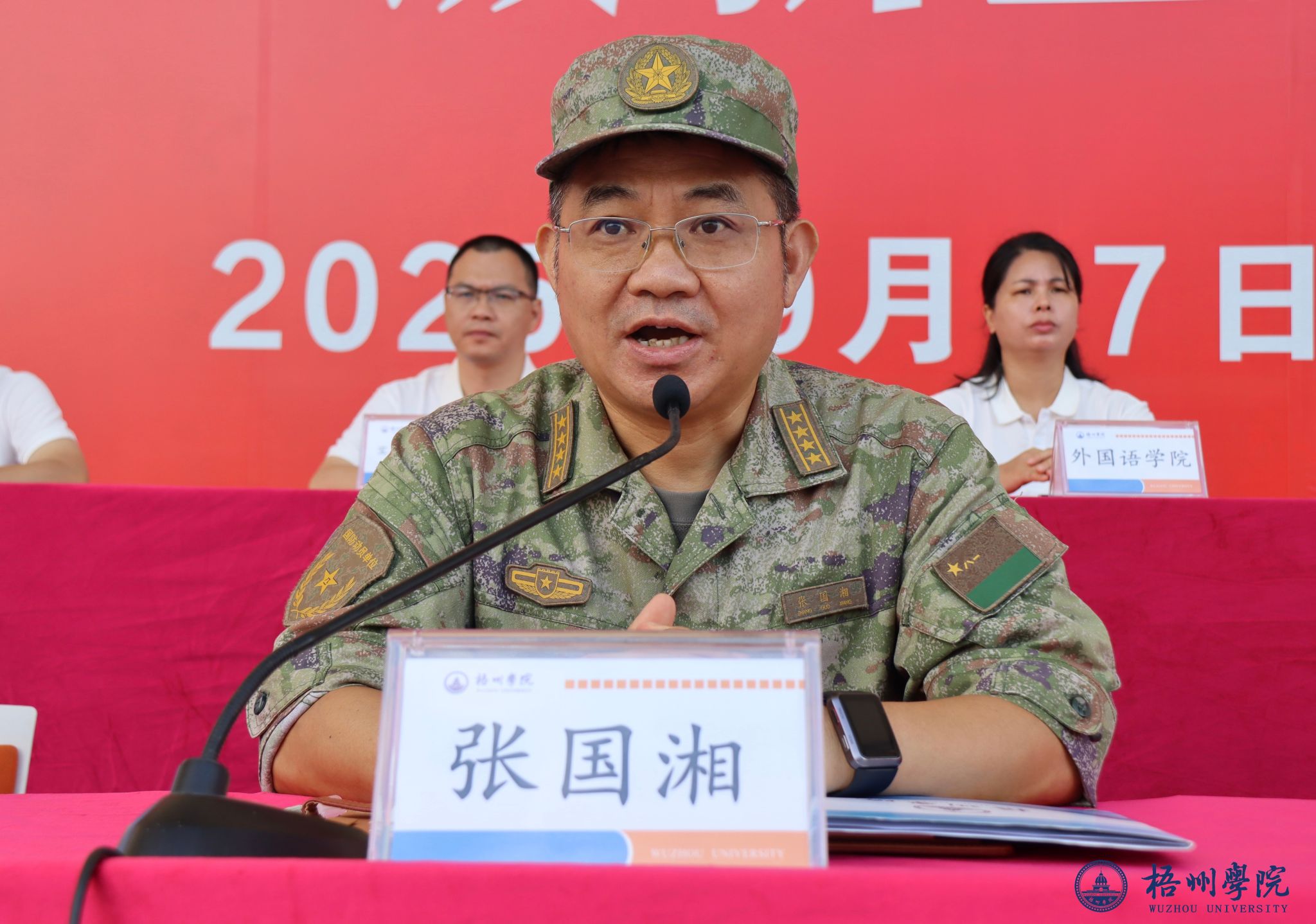 梧州军分区政治委员张国湘大校在讲话中指出,大学生军训是党中央,国务院和中央军部作出的一项重大决策。在此次讲话中,他对校部共建取得的成果表示肯定,对学生表达了不负青春、牢记使命的殷切期待,对教官作出“既当兄长,又当师长”的指示。他希望同学们能够把笑容留给阳光,让名字写满责任,积极向上,一直向前,担当民族复兴的时代重任,希望教官们能够以身作则,当好榜样。