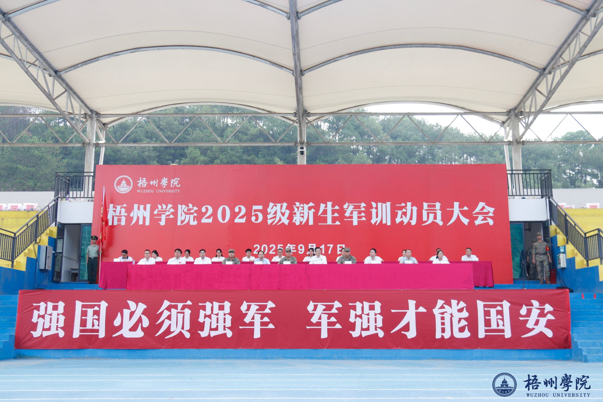 9月17日上午,学校在北校区田径场举行2025级新生军训动员大会。学校党委书记童晓晖,党委副书记梁业华,梧州市委常委、梧州军分区大校、政治委员张国湘,梧州军分区战备建设处上校、处长曾庆文,梧州市万秀区人民武装部上校、部长于海明出席活动,学校2025级新生军训工作领导小组成员,2025级新生辅导员、班主任及2025级全体参训新生参加活动。活动由学校党委副书记梁业华主持。