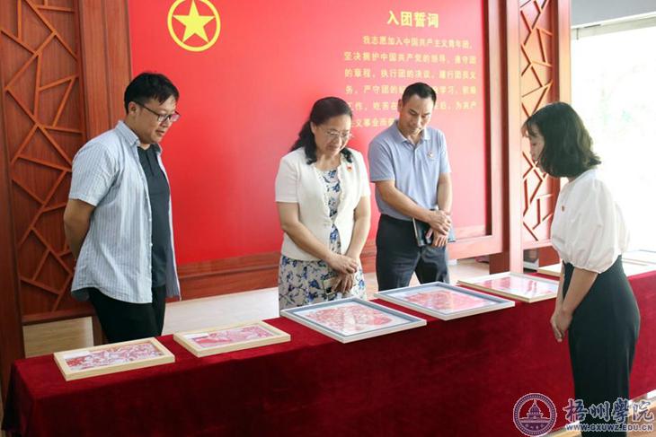 在作品展示环节,作品区整齐摆放着支部团员以“喜迎二十大”和“庆祝建团100周年”为主题元素的作品,作品涵盖了剪纸、绘画、版画、黏土、捻纸、衍纸、歌舞表演等门类,以此献礼建团百年,喜迎党的二十大胜利召开。韦仕珍书记走进作品展区,一边聆听学生代表的讲解,一边欣赏同学们的作品。她说道:“每个作品都蕴含着深刻寓意,讲述着动人的故事。同学们能真真正正地了解历史,并把历史融入作品中,这是值得鼓励的。”她指出,此类主题团日活动形式可以向全校各班团支部进行展示分享、提供经验,推动各学院结合专业特色开展卓有成效的团支部活动,形成浓厚的学习活动氛围,进一步学深悟透总书记的重要讲话精神。