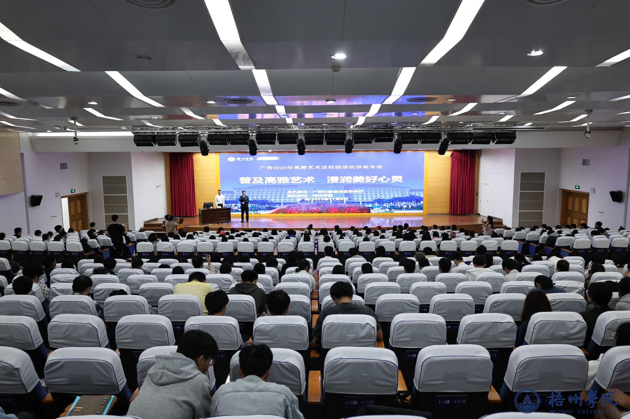 11月6日,由广西壮族自治区教育厅主办、梧州学院承办的2025年高雅艺术进校园活动讲座专场在明理楼一楼学术报告厅举行。来自柳州市艺术剧院党委书记、院长叶苗壮以题为《舞台上的广西故事——漫谈民族舞蹈创作思维与时代价值》为我校师生带来一场关于艺术创作、文化传承与时代使命的深度分享。党委宣传部、校团委、教师教育学院相关负责人,600多师生共同参加活动。