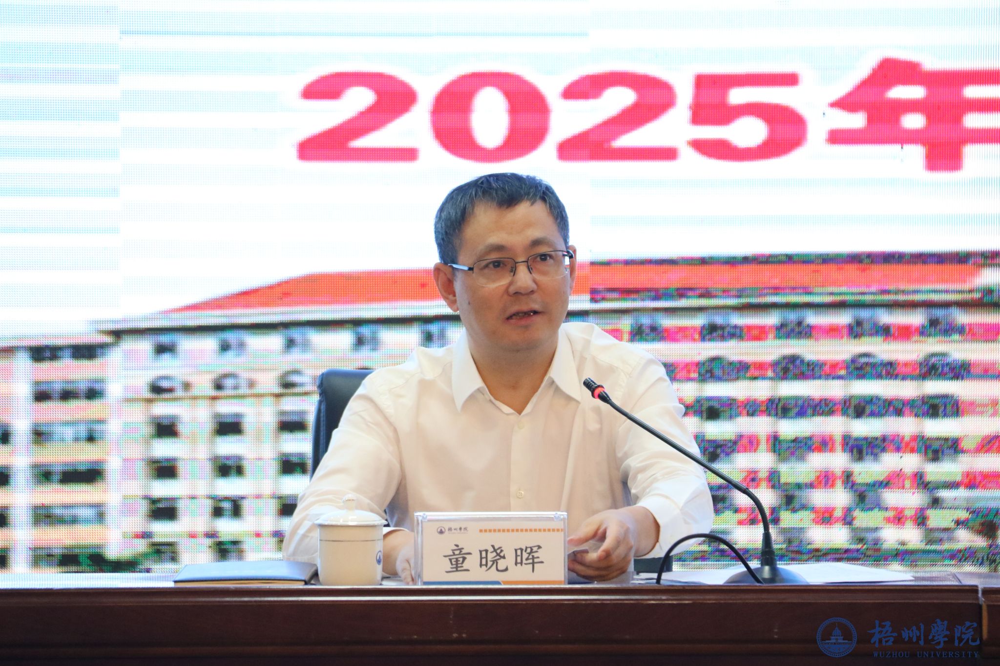 童晓晖书记作总结讲话,他对学校目前取得的科研成果表示肯定。他指出,科研工作要有主动性、积极性和创新性,是一个从量变到质变的过程。学校要直面现在科研发展中面对的问题、困境和发展瓶颈,找到破解的方法,落实申报的每一个环节,全面提升2026年度国家基金项目申报的数量和质量。要了解发达地区与落后地区的科研实力的差距问题;学校科研工作要明确学校科研氛围、政策、导向不足,教师科研意识薄弱的问题。同时童晓晖书记指出,一是要强化科研意识,全局统筹定位科研重要地位。“十五五”期间梧州学院必须走内涵高质量发展之路,而科技创新能力的提升和科研工作的推进是内涵发展的必由之路。二是转变科研发展理念,推进科研反哺教学发展。结合高校自身的性质和任务合理定位,建立有效的教学与科研管理机制,把科研融会贯通于教学过程,积极推动高校发展产学研模式的形成。三是要淬炼科研作风,“校-院-师”协同攻坚克难。教职工自身科研的发展与学校整体实力的提升是相互依赖、相互支撑、唇齿相依、共同进退的关系。要以“功成不必在我、功成必定有我”的担当,以协同作战的合力、精益求精的态度,共同攻克申报路上的一道道难关。他强调,全校上下要秉承本次动员部署大会的契机,进一步调动广大教师开展科研工作的积极性、主动性和创造性,在全校形成人人关注科研、人人参与科研、人人崇尚科研的良好氛围,要淬炼“科研钻研真如铁,而今迈步从头越,信念坚韧何所畏,砥砺前行勤治学”的科研作风。