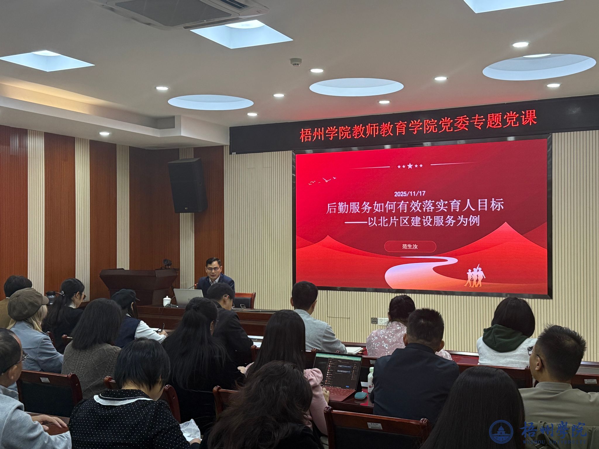 11月17日晚,学校副校长范生汝在明理楼七楼视频室,以“后勤服务如何有效落实育人目标”为主题,为教师教育学院全体师生党员带来一堂生动深刻的党课。党课紧密结合学校北片区建设实践,深入阐释“后勤即育人”核心理念,凝聚师生党员共建高质量育人环境共识。