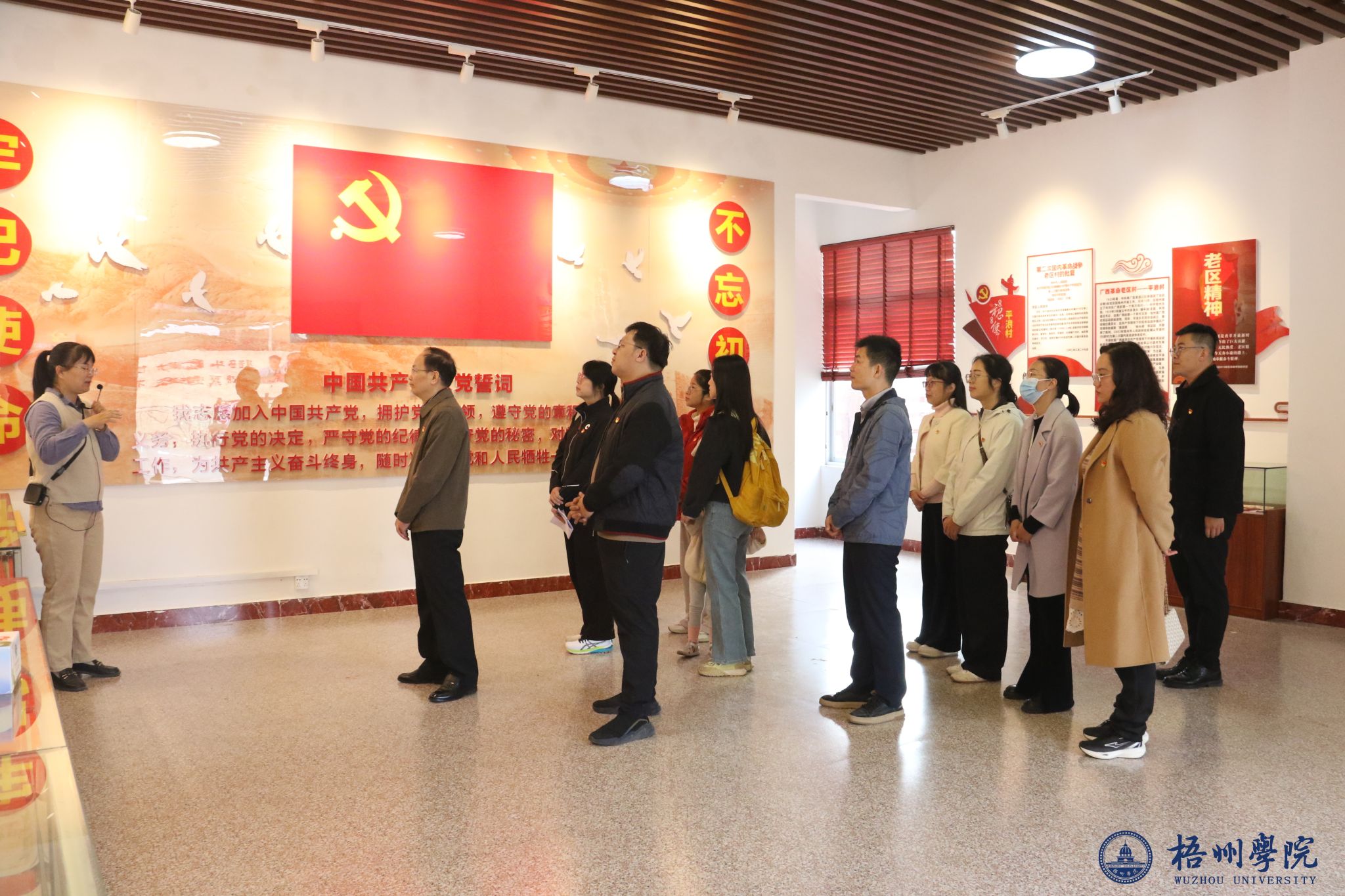 11月23日,学校党委副书记梁业华在广西革命老区第一村——平浪村村委会议室,为组织宣传党支部全体党员讲授党的二十届四中全会精神专题党课。党委组织部、党委宣传部全体党员参加学习。