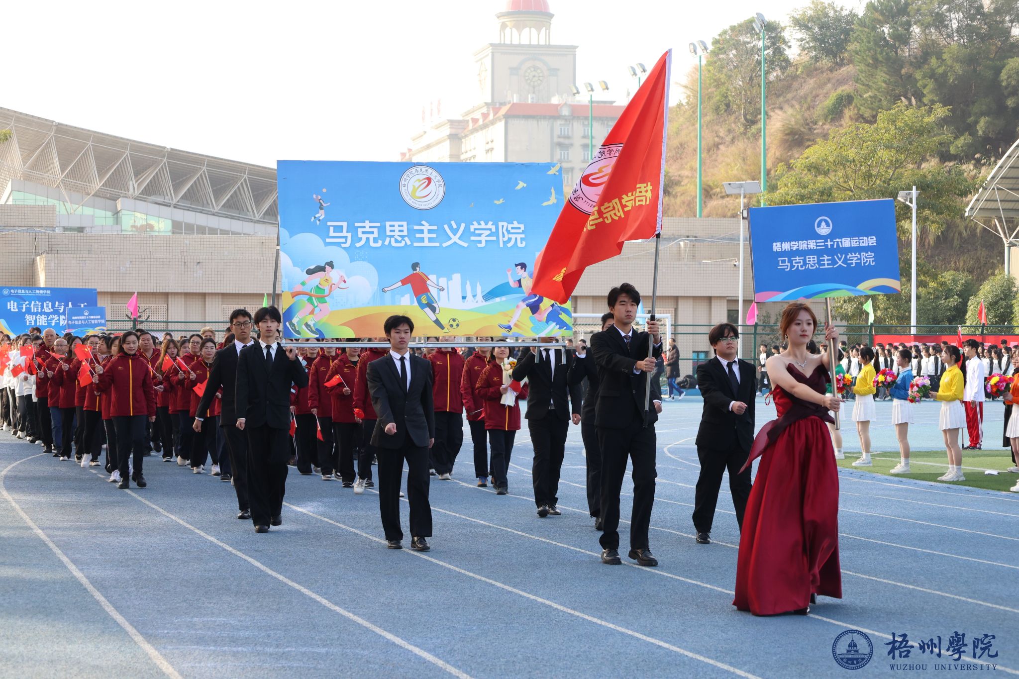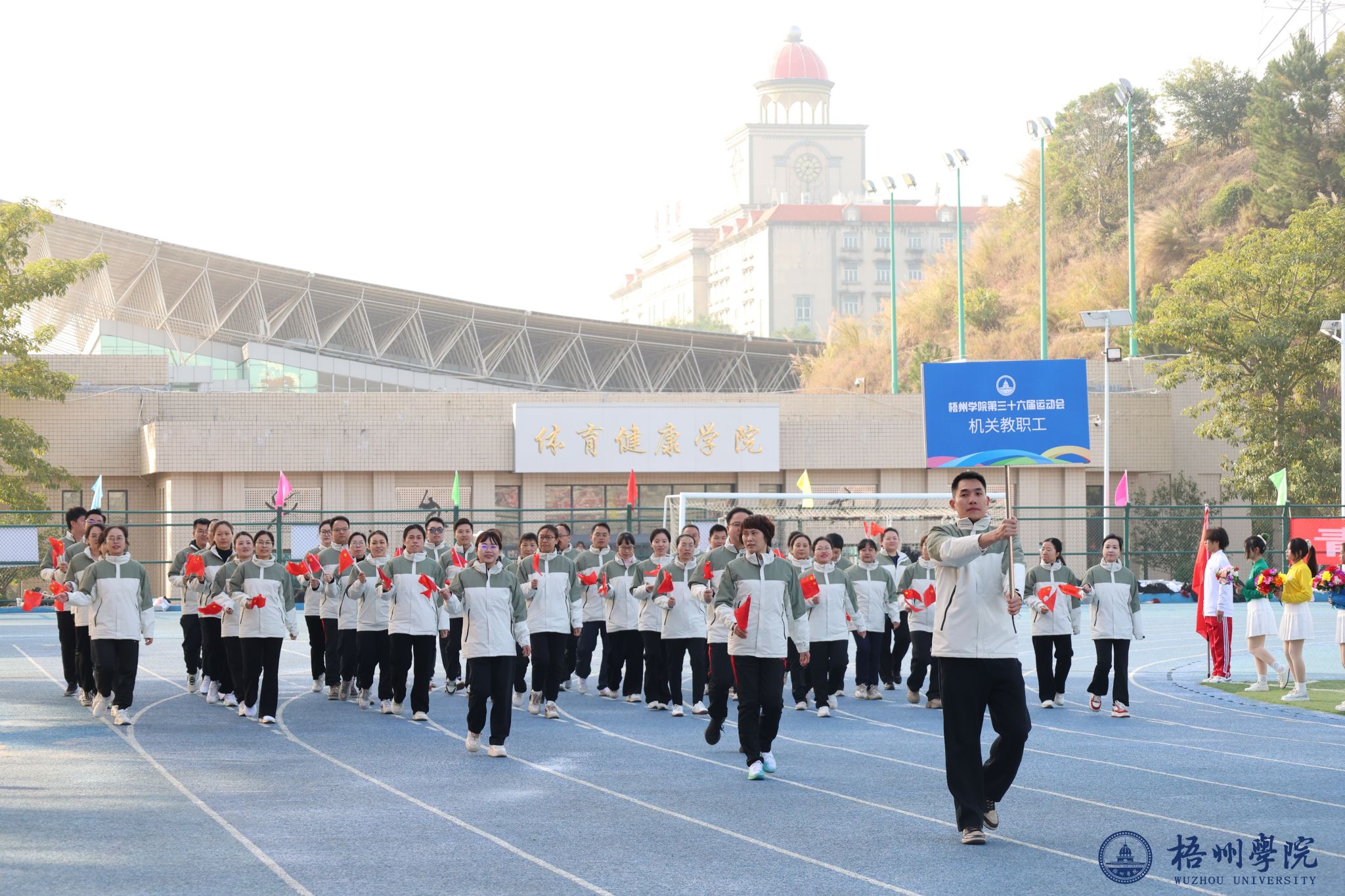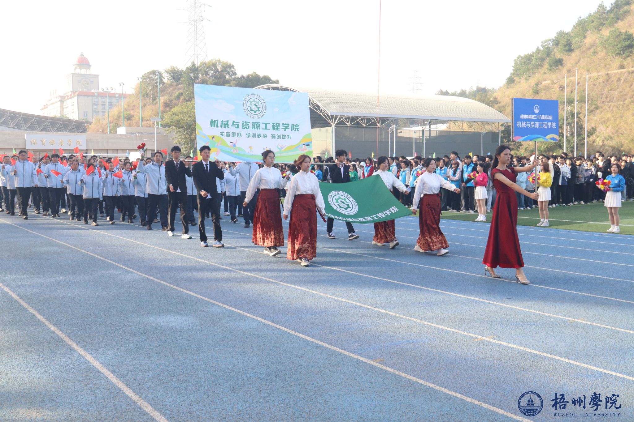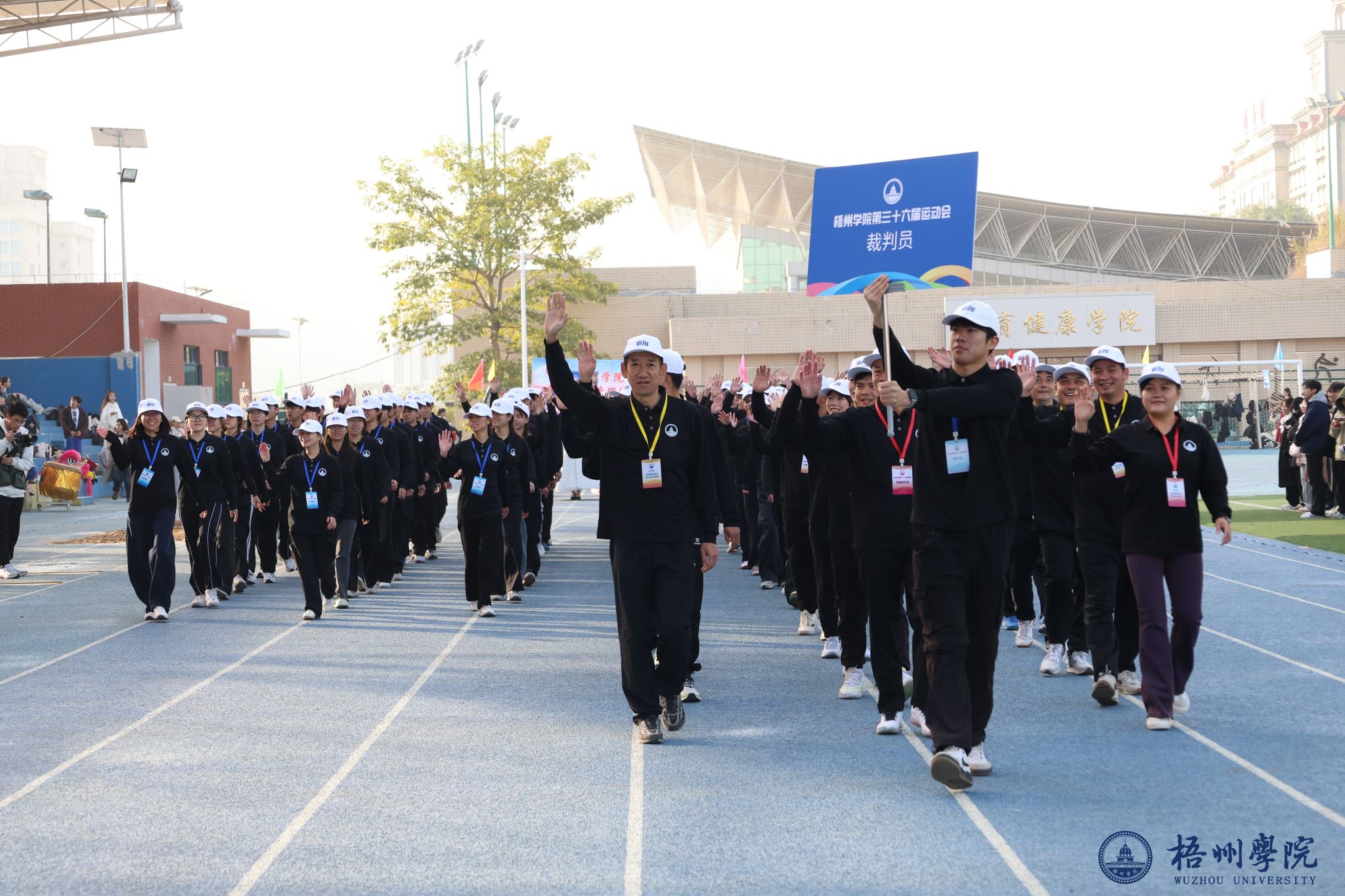 随后,各学院方块队逐一亮相。管理学院方队尽显严谨务实作风,机械与资源工程学院方队展现工科专业特色,文学与传媒学院方队洋溢着人文气息,食品与制药工程学院方队传递健康理念,教师教育学院方队凸显育人情怀,宝石与艺术设计学院方队尽显创意活力,外国语学院方队展现国际视野,经济学院方队彰显进取精神,体育健康学院方队活力四射,法学院方队尽显严谨风范,马克思主义学院方队传递思想力量,电子信息与人工智能学院方队展现科技魅力。机关教职工方队展现出教职工的良好风貌,裁判员方队则以专业姿态亮相。各方块队的精彩表现,为第三十六届运动会开幕式画上了圆满的开篇,也激发了全体师生参与运动、奋勇拼搏的热情。