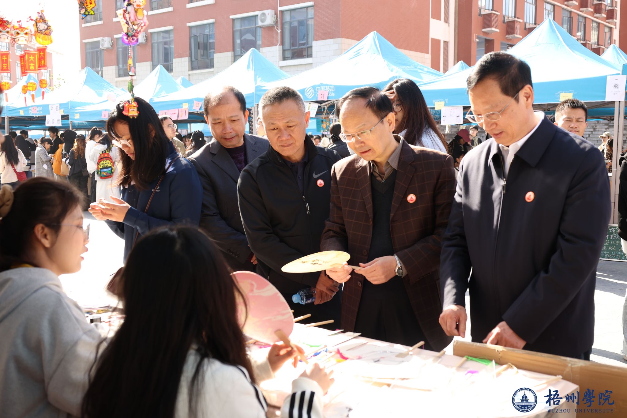 活动期间,学校领导麻新纯、梁业华、覃雄彪专程来到街展现场,看望参与活动的同学们。领导们的到来,瞬间点燃了现场的热情。同学热情地围拢上前,争相介绍自家摊位的创意产品,细致展示亲手打造的创业成果。“这个漆扇的纹样是我们结合梧州骑楼元素设计的”“这款香囊的配方经过了多次调试,香味持久又独特”……同学们兴奋地介绍产品的设计理念、研发过程与实践心得。领导们耐心倾听同学们的介绍,不时点头称赞,针对产品定位、推广方式等问题与同学们深入交流,并提出中肯的建议,现场互动氛围热闹而又亲切。