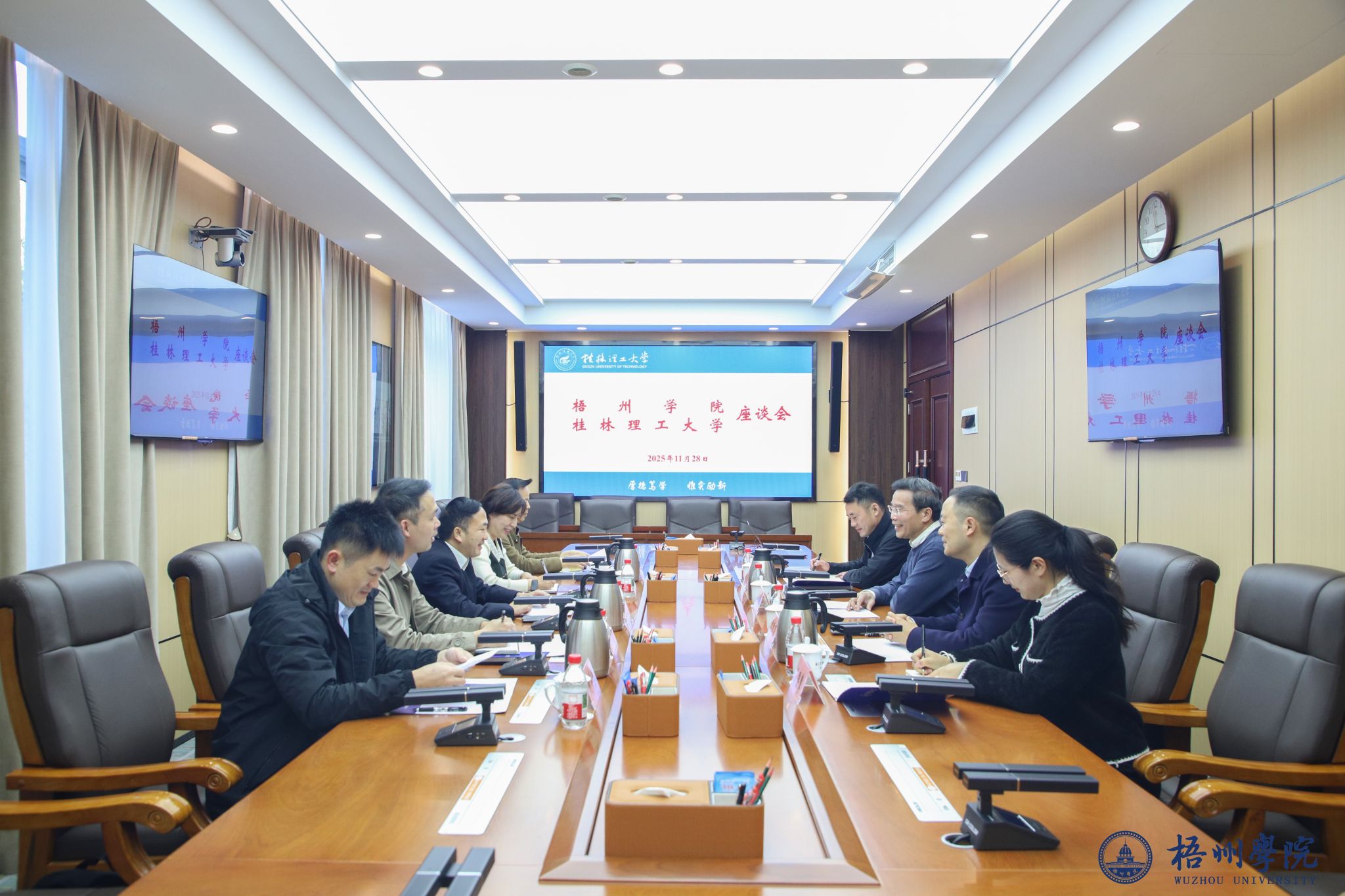 下午,调研组前往桂林理工大学调研交流。桂林理工大学党委副书记、纪委书记、自治区纪委监委驻校纪检监察组组长韦学敏在屏风校区办公楼第一会议室热情接待了考察组一行,他对考察组的到访表示热烈欢迎,简要介绍了桂林理工大学的历史沿革、专业特色、办学成就,以及纪检监察工作的整体布局与发展成效,并希望以此次交流为契机,全面深化两校纪检监察工作的互动协作,共同为服务教育强区建设贡献力量。座谈中,桂林理工大学纪检监察部门负责人详细介绍了该校在谋划纪检监察工作总体思路、推动高质量监督落实、拓展问题线索来源、强化重点领域监督等方面的实践探索与显著成效。叶昊对桂林理工大学纪检监察工作给予高度评价,认为桂林理工大学的先进经验为梧州学院纪委破解工作难题、提升工作质效提供了重要借鉴。双方围绕纪检工作中的堵点难点问题进行了深度研讨,在监督方式创新、线索处置规范、制度机制建设等方面形成诸多共识。会后,在桂林理工大学纪检监察部门同志的陪同下,调研组还实地参观了该校温馨谈话室和标准谈话室,直观了解其规范化建设情况。