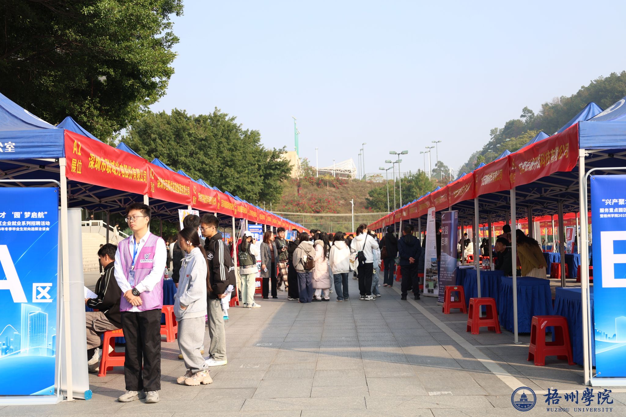 为深入贯彻落实党中央、国务院“稳就业”“保就业”决策部署,进一步促进我校2026届毕业生实现更高质量和更充分就业,切实搭建用人单位与毕业生之间的精准供需对接平台,12月6日上午,学校在体育馆前广场举办2025冬季毕业双向选择洽谈会。本次双选会由梧州学院与梧州市人力资源和社会保障局共同主办,由梧州市就业服务中心、梧州市人力资源服务中心、梧州市人才服务中心及梧州学院就业与职业发展工作联会协办。采用线上线下结合模式,共吸引230余家优质企业参会,3880余岗位招聘,涉及人力资源、传媒、教育、餐饮、互联网科技、制造、珠宝、人力资源、旅游发展、新能源、金融、电商运营等多个领域。