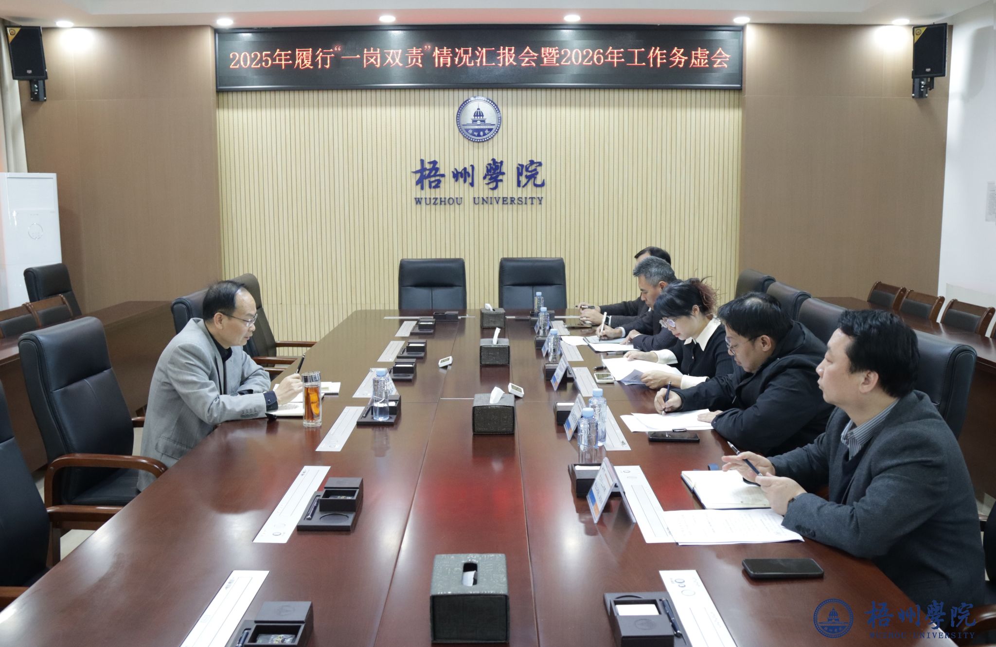12月18日,学校党委副书记梁业华主持召开分管部门2025年履行“一岗双责”情况汇报会暨2026年工作务虚会,总结回顾过去一年各部门负责同志履行“一岗双责”情况,总结经验做法,查摆短板不足。组织部、机关党委、宣传部、统战部、学生工作部(处)、校工会、校团委主要负责人参加会议。