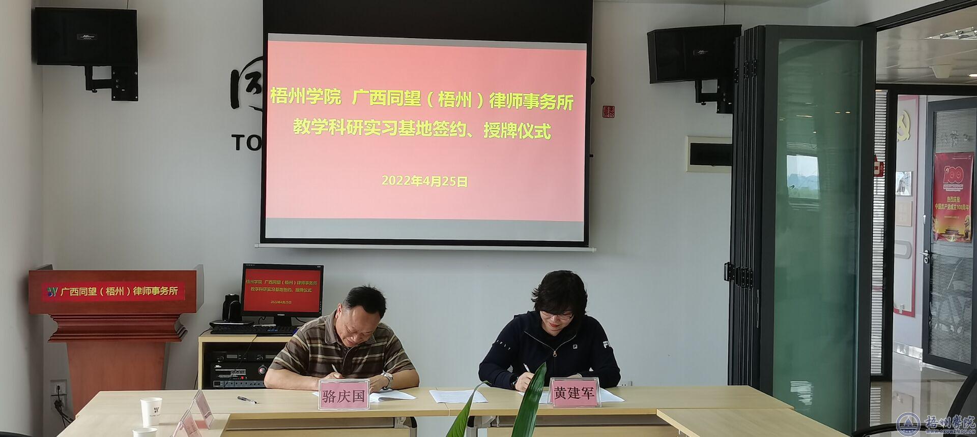 调研组先后走访了广西益远律师事务所和广西同望(梧州)律师事务所。在调研座谈会上,双方就人才培养、学生实习实训和拓展就业岗位等方面展开交流,邱房贵副校长认真听取了两个律师事务所相关方面的介绍,他对律师事务所长期以来对学校发展的大力支持表示感谢,希望借此调研机会加强校企交流,拓宽校企在学生实习、就业等方面的合作,双方合作再上新台阶。邱房贵副校长与广西同望(梧州)律师事务所签订了共建法学专业合作协议,并为广西同望(梧州)律师事务所梧州学院教学科研实习基地揭牌。