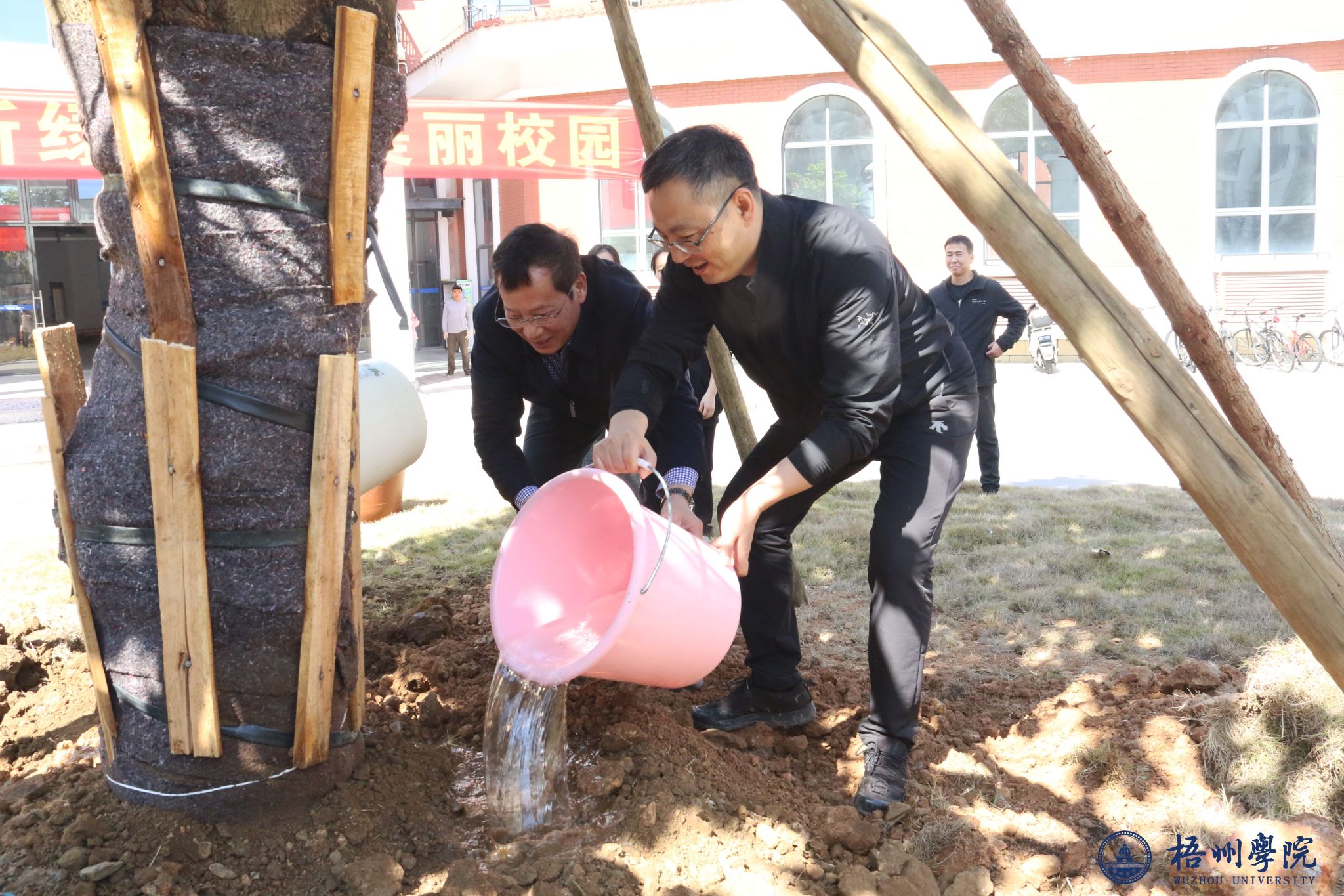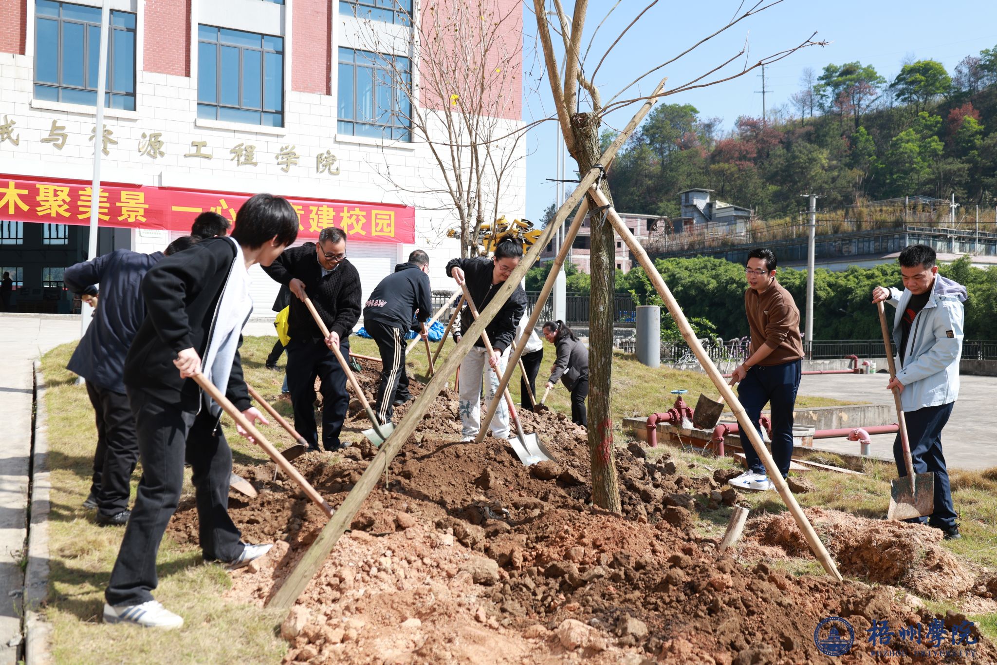 在活动现场,悬挂着“植下梧院新绿,共创美丽校园”的标语。学校领导和师生们分组协作,挥锹铲土、扶树填坑、提水浇灌,现场一片繁忙景象。此次活动共种植了1棵六旺树和8棵黄花风铃树,为初春的校园新增了几分勃勃生机。童晓晖书记在活动现场指出,植树造林既是美化校园环境、筑牢生态底色的务实举措,更是培育师生生态文明素养的生动实践。他勉励全体师生要自觉爱护校园内的一草一木,携手守护整洁优美、绿意盎然的校园环境,合力打造生态宜居、文明和谐的美丽梧院。