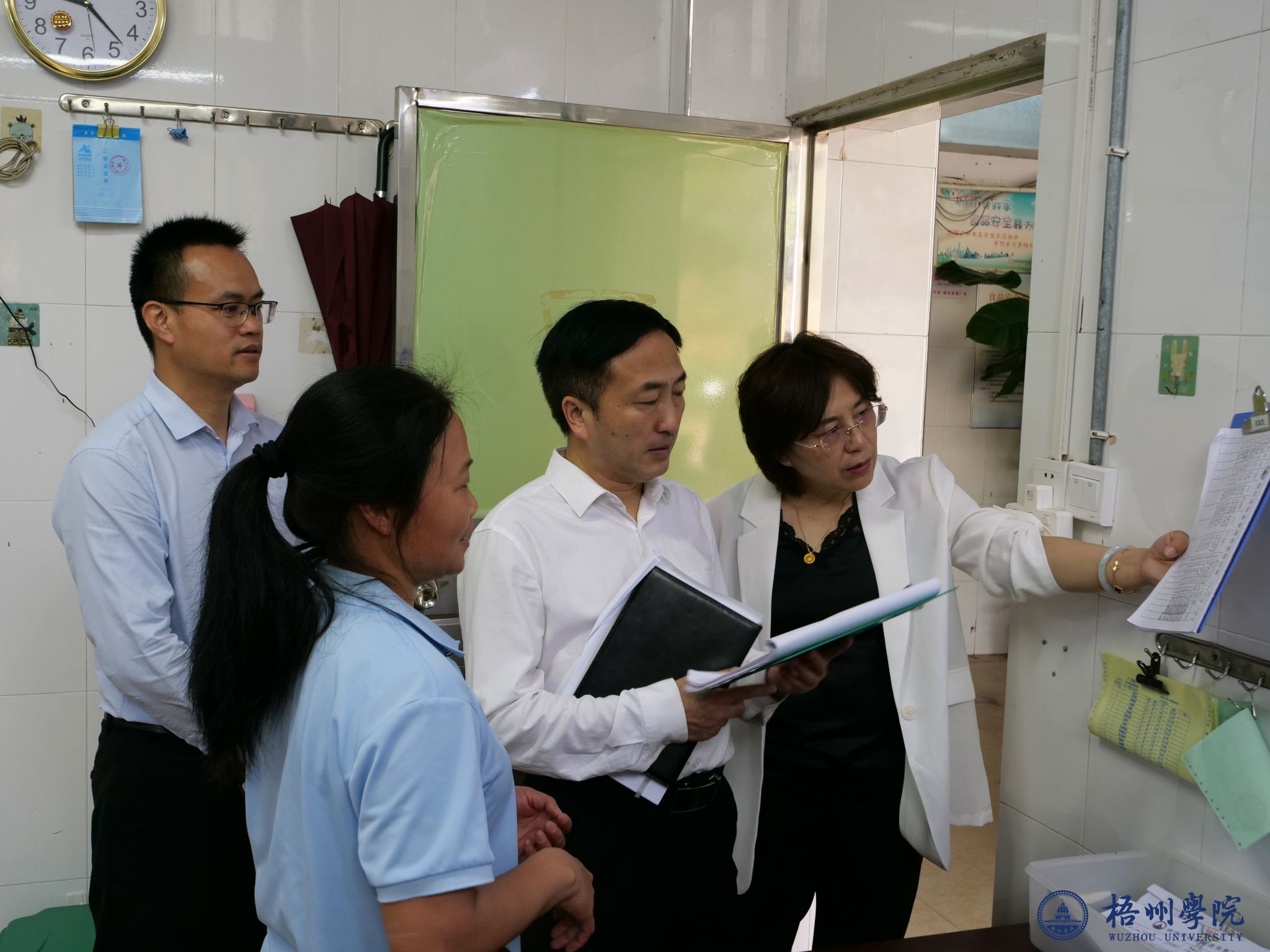叶昊一行先后走访北区食堂、校园直饮水机房、外包物业服务点、卫生所、食堂采供部,实地检查运营管理、服务保障、安全管控及廉政风险防控工作,现场查阅台账、听取汇报、问询关键环节,全面了解后勤服务保障工作开展情况。