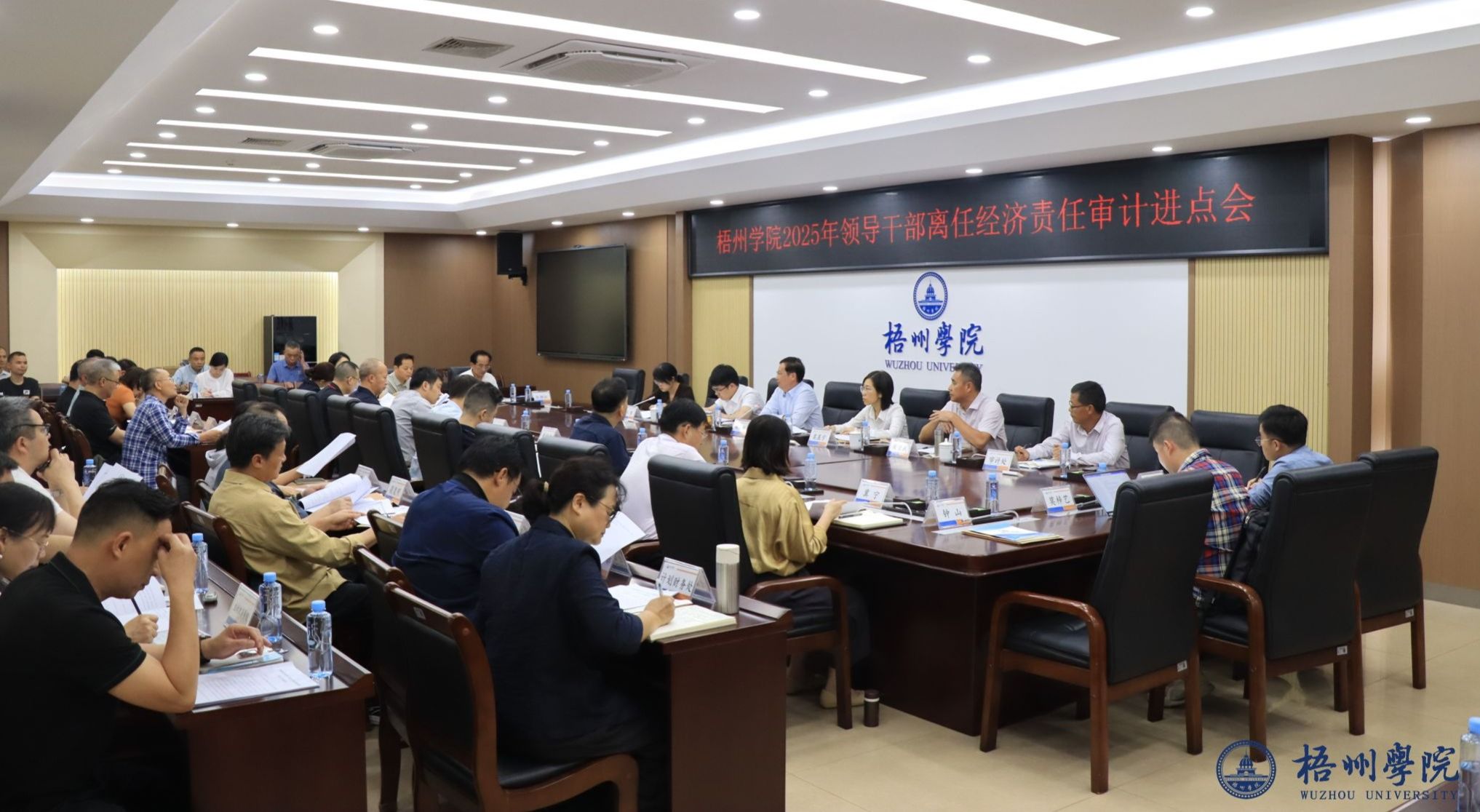 3月27日,学校在明理楼八楼第一会议室召开2025年领导干部离任经济责任审计进点会,学校领导麻新纯、莫晨宇、邓小林出席会议。审计处全体人员,各被审计对象,现岗位任职领导(或部门主要负责人),以及被审计对象联络员,和学校合作的会计师事务所相关负责人参加会议。