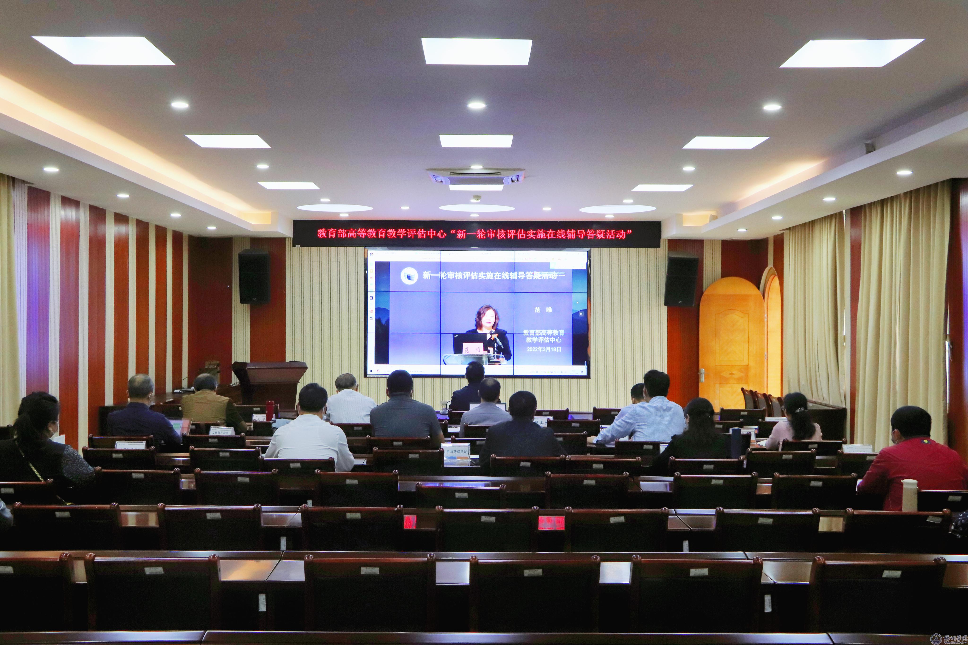 3月18日上午,学校在明理楼七楼视频会议室在线参加教育部高等教育评估中心举办的网络直播——新一轮审核评估实施在线辅导答疑活动。学校副校长麻新纯,校内各二级学院分管教学工作副院长、教务处班子成员及相关科室人员参加会议。