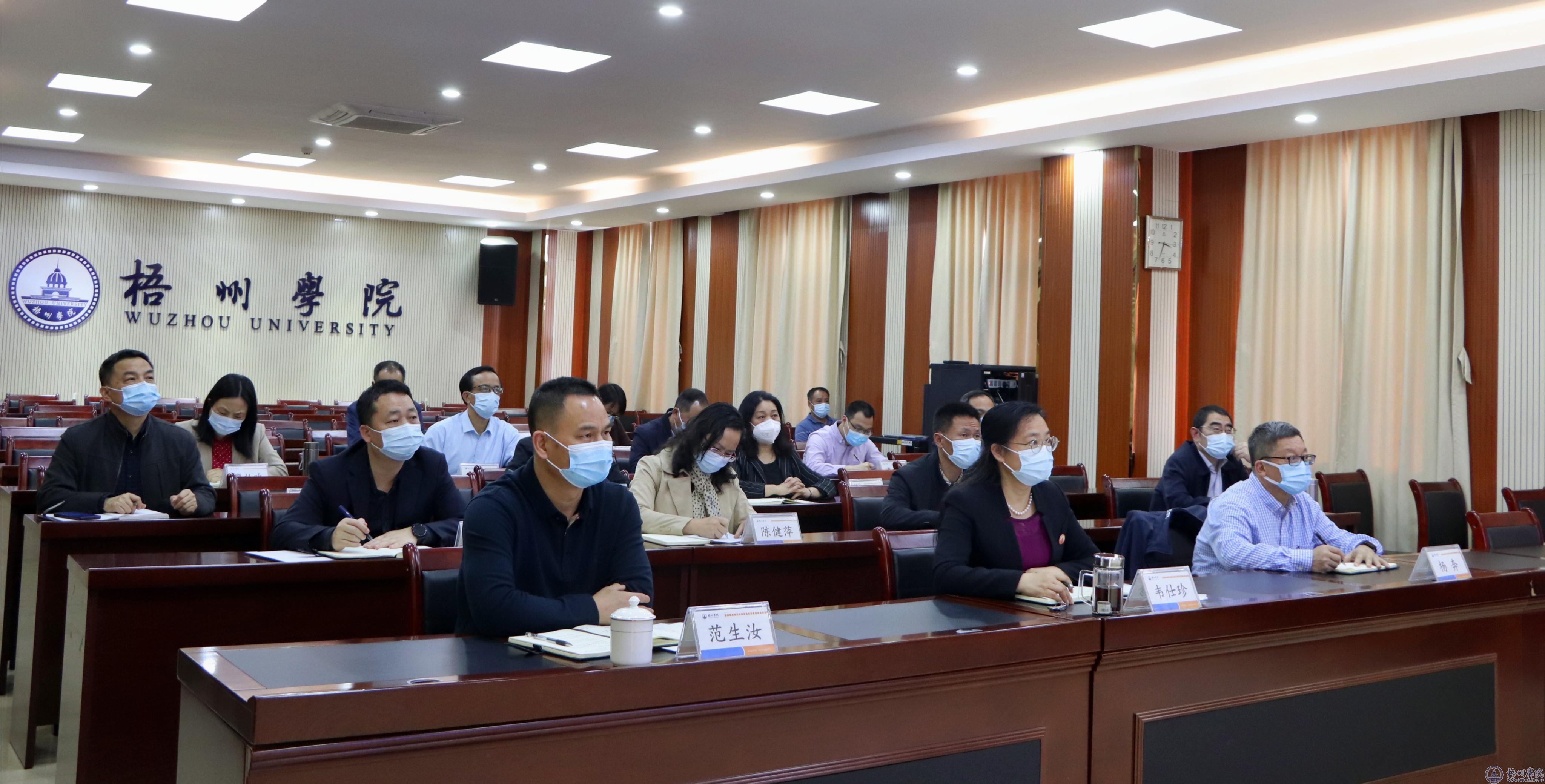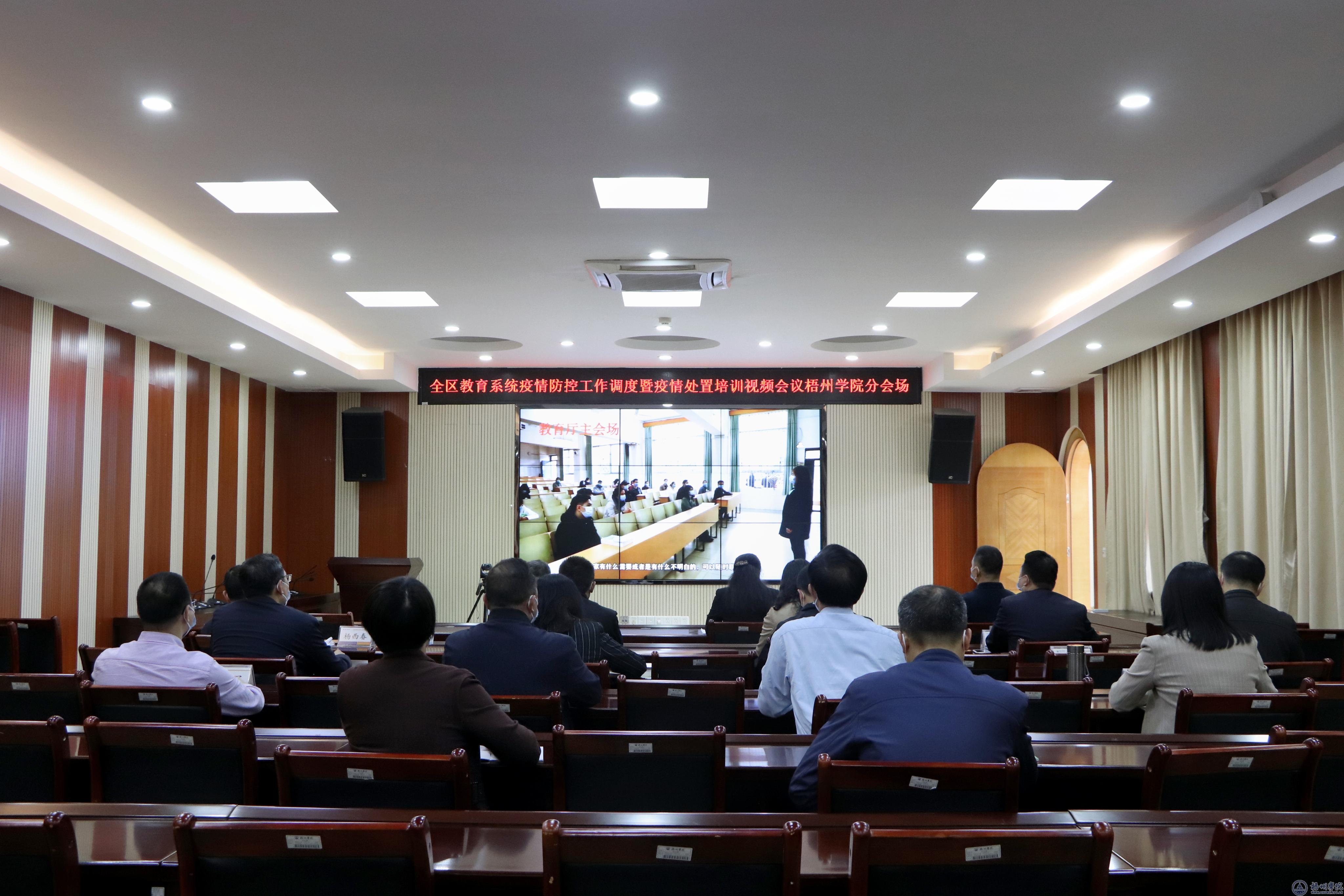 我校在明理楼七楼视频会议室设立分会场。学校领导韦仕珍、杨奔、范生汝;办公室、党委宣传部、学生工作部(处)、人事处、教务处、国际交流处、财务处、国有资产管理处、后勤基建处、保卫处、继续教育学院主要负责人;学校疫情防控工作领导小组指挥部办公室、各工作组负责人在分会场参加会议。