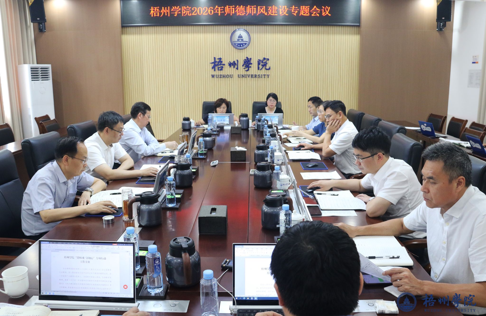 4月9日,学校在明理楼八楼第二会议室召开2026年师德师风建设专题会议。校领导童晓晖、麻新纯、梁业华、范生汝、邓小林、莫晨宇、叶昊出席会议,党委(校长)办公室、纪委办公室、监察室、党委组织部、党委宣传部、党委统战部、党委教师工作部、人事处、教务处、科研处、社会科学研究处等部门主要负责人参加会议。
