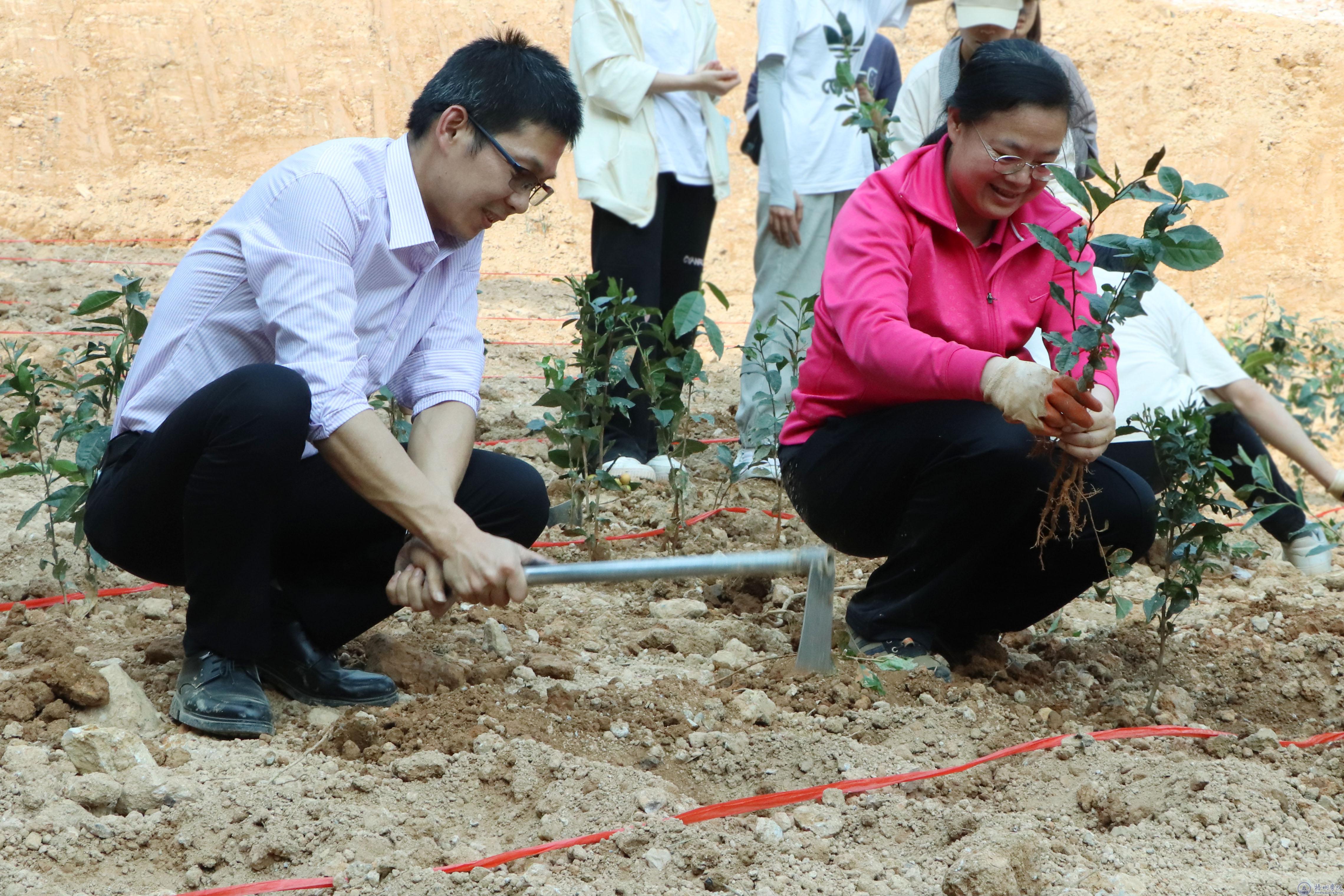 现场一片挥揪铲土、植苗培土的景象。韦仕珍书记一边给茶苗培土,一边询问同学们的学习情况,叮嘱他们要德智体美劳全面发展,不能忽视“劳”的作用,要不断增强劳动意识,一边向食药学院的教师了解茶苗的栽培管理要点。